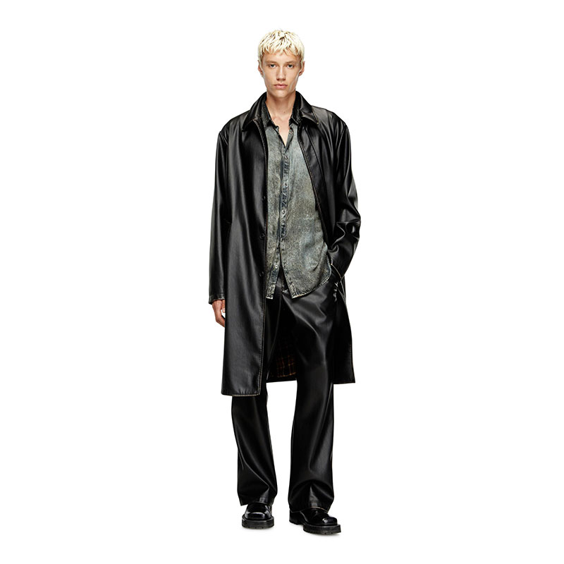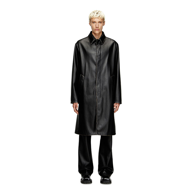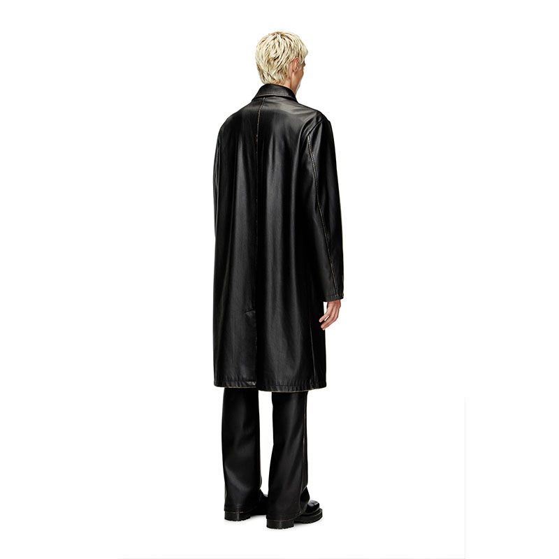 This men's sleek black car coat has been brushed by hand to create a distressed effect along the edges and seams. Detailed with an embossed Oval D logo on the sleeve, it has a regular fit and a falls to a knee length. The check flannel lining at the body adds a graphic touch and lightweight insulation.