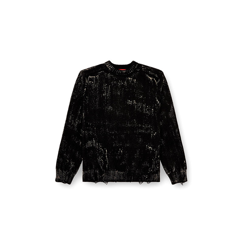 Knitted from a wool blend, this men's sweater has undergone a special treatment that leaves the colour looking swiped on fast, like paint dragged across the surface. Ripped cuffs and hem dial up the DIY aesthetic with lived-in destruction.