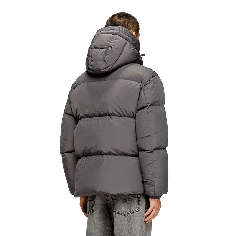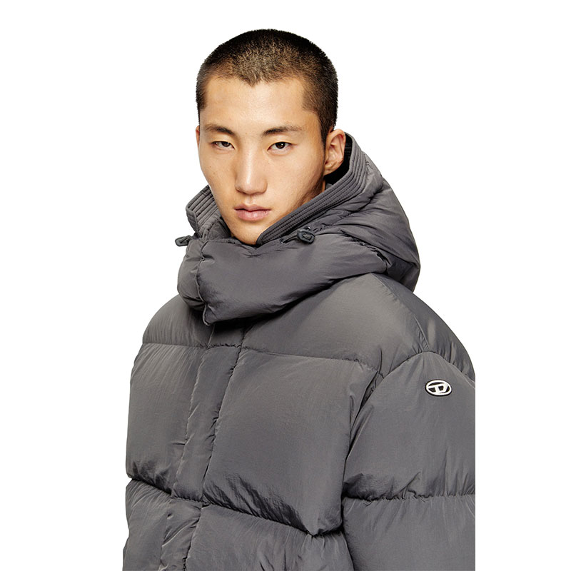 This men's regular-fit puffer jacket is built from certified recycled nylon taslan with a ViralOff finish. Ultra-lightweight design with down padding and a detachable visor-equipped hood. An embroidered Oval D patch adorns the left sleeve.