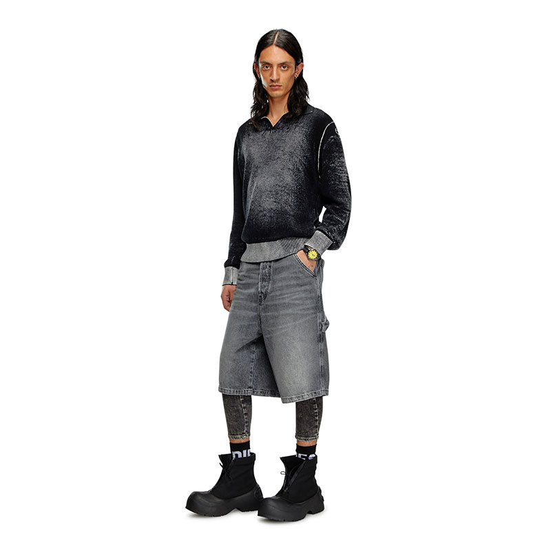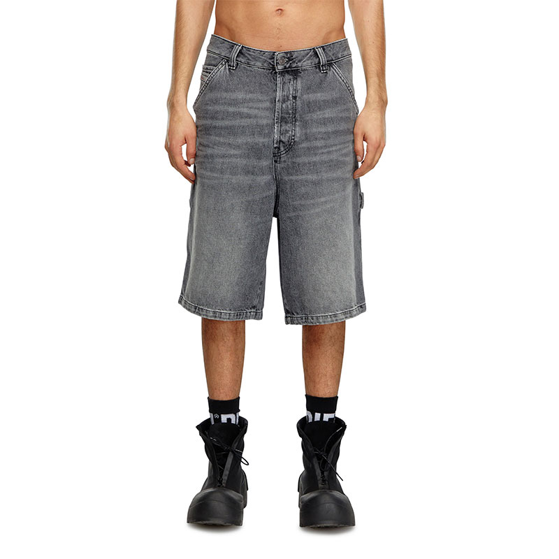 These men’s denim shorts feature a relaxed-leg, knee-length fit and workwear-inspired details, such as the hammer loop and small patch pockets on the side of the leg.