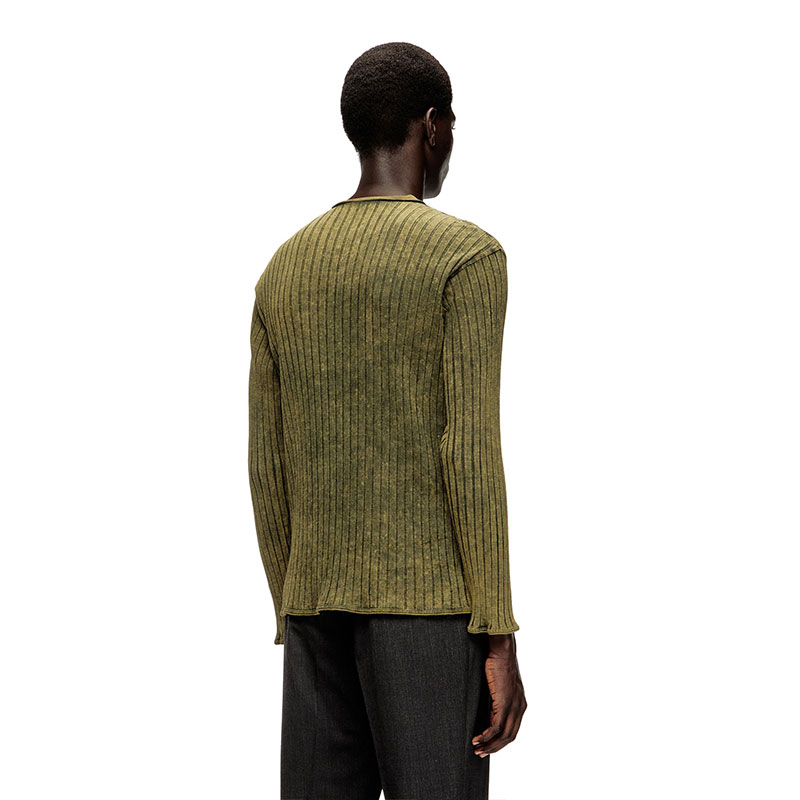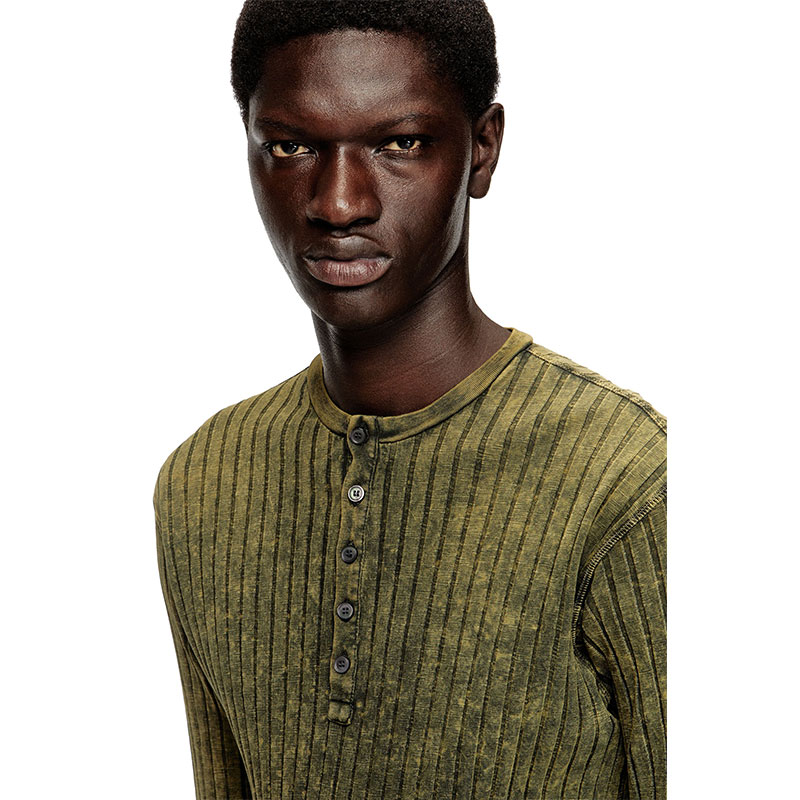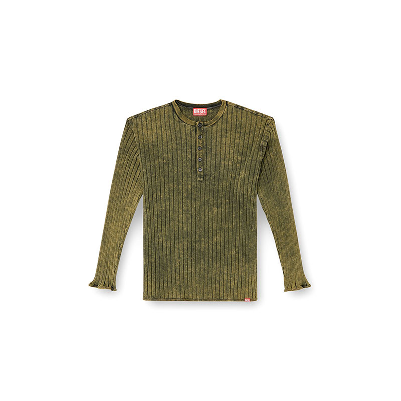 Knitted with a flat wide rib, this men's long-sleeve Henley top is part of the Fall Winter 2025 Runway Show collection. A pigment-dyed treatment gives it an uneven colouring for a lived-in look. Edged with a stretchy trim, the hem can be worn tucked up above the waist too.