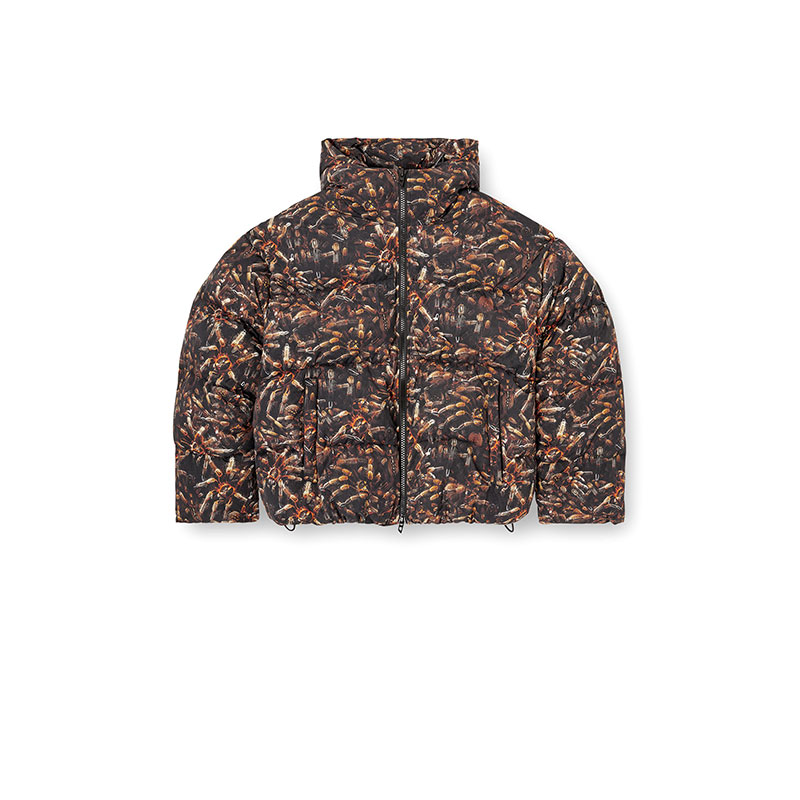 The tarantula print on this men’s quilted jacket makes you forget the creature’s solitary nature. Made from lightweight recycled nylon winterproofed with padding, it’s equipped with secure zip pockets and a cosy lining at the hood. Drawstring-adjustable cuffs and hem trap heat when the temperatures plummet.