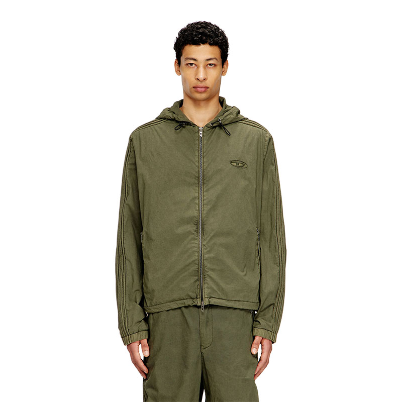 Men’s jacket in treated cotton poplin, featuring a regular fit, drawstring hood and two-way zip fastening. A fusion of athletic and utilitarian codes, it’s decorated with tactile corded bands down the sleeves and lined in breathable mesh. An embroidered Oval D logo marks the chest.