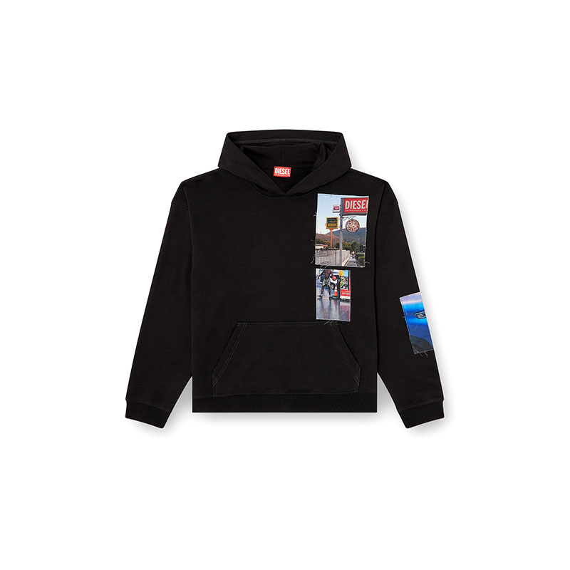 This men's hooded sweatshirt is embellished with raw-cut photographic patches that incorporate a variety of Diesel logos in the details. Its relaxed silhouette is built from organic cotton jersey.