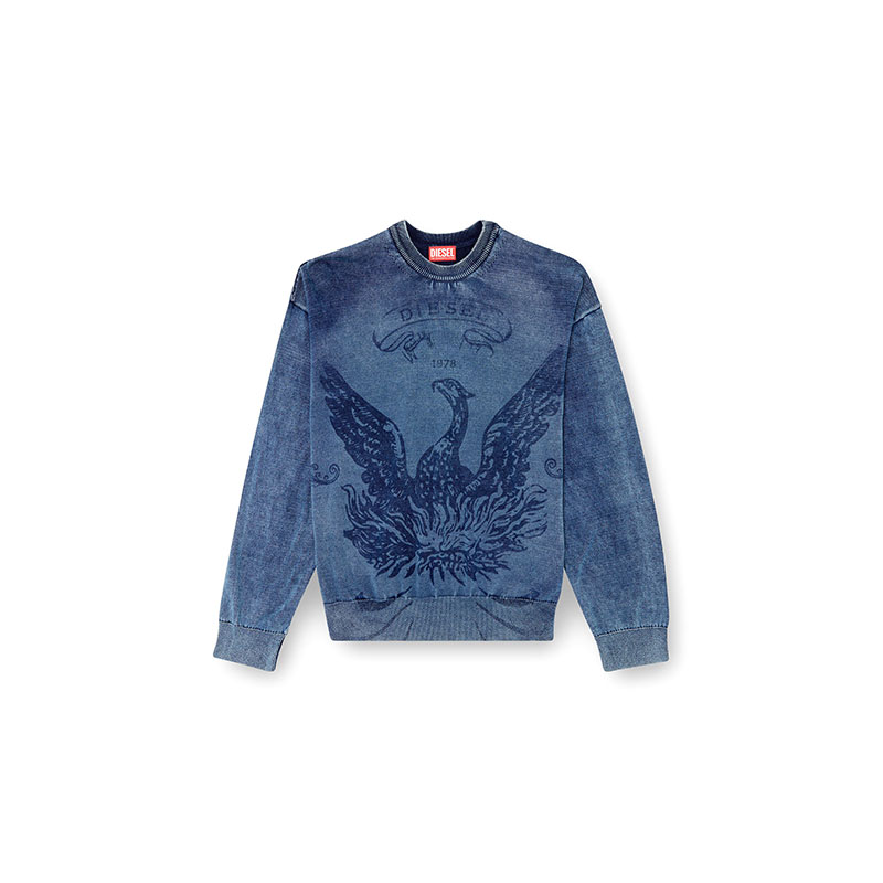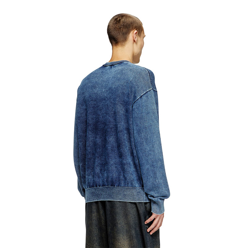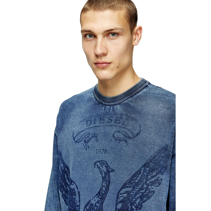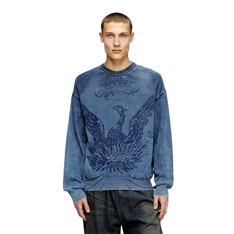 This men's sweater draws from Diesel's DNA fabric – denim – for design inspiration. Comfortably oversized, it's knitted from organic cotton, dyed in real indigo and stonewashed down to a lived-in blue hue. Laser technology is applied to the front, giving rise to the Phoenix logo.