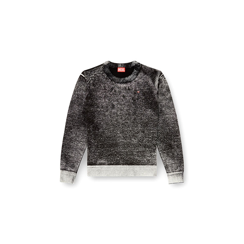 This men's cotton sweater is cut for a regular fit and features a micro-sized Diesel logo embroidered on the chest. The colour – moody and worn away, with decidedly lighter areas – bleeds from a print applied on the inside of the knit, serving raw DIY energy and grit.