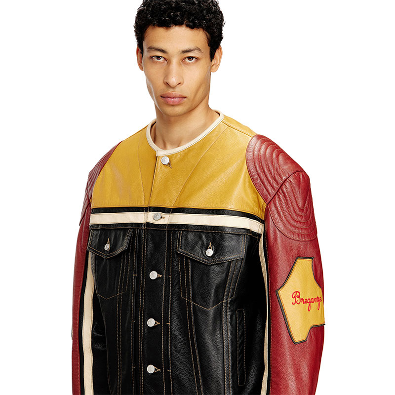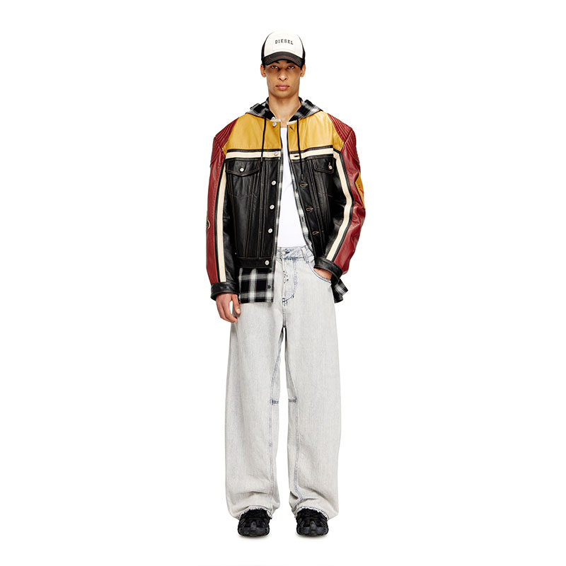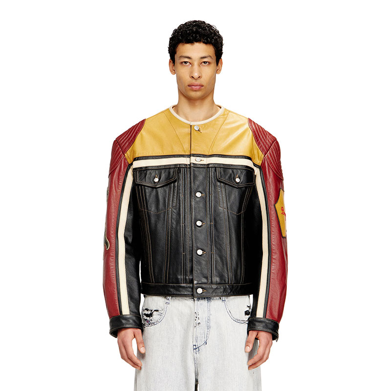 Biker jacket crafted from cow leather with a contrasting panel design, featuring quilted details on the shoulders, snap button closure, flap pockets and welt pockets on the front. Complete this unisex jacket the bold graphic patches on the sleeves with embroidered lettering and a large Diesel logo across the back for an iconic statement.