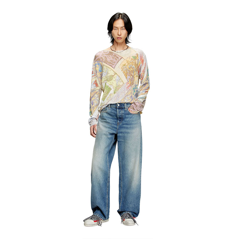 Men's rib-knit sweater crafted from 100% low-impact linen. Part of a creative collaboration with an artist, this style features a regular fit and medieval-inspired artwork in muted multicolour tones.