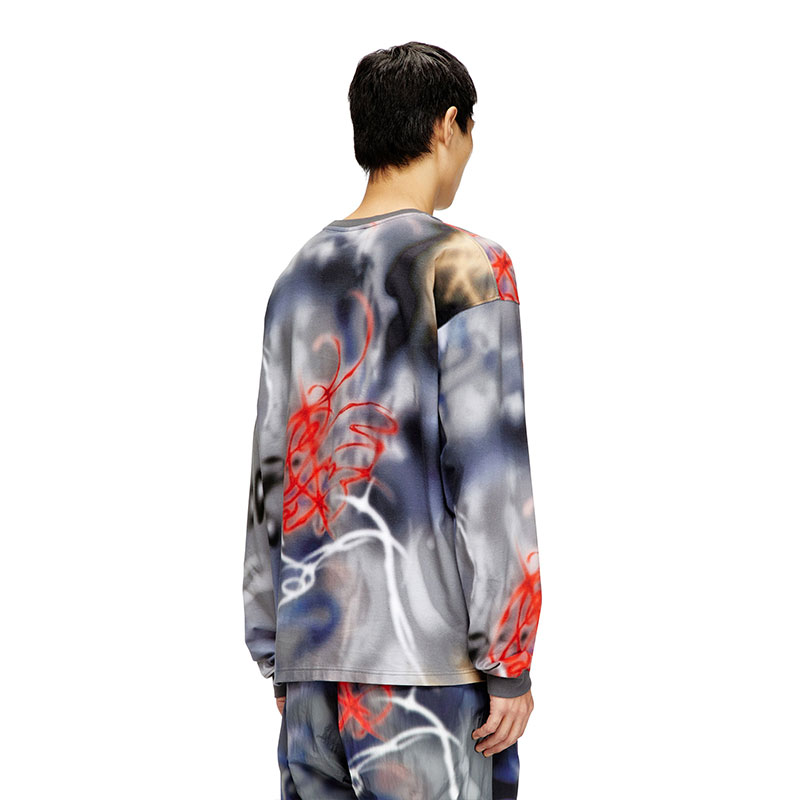 Echoing the graphic motifs of the FW25 Runway Show, this men's long-sleeve t-shirt is crafted from lightweight single jersey made with 100% organic cotton with a fresh feel. Effortlessly wearable, it's printed all-over with graffiti-effect light streaks, and features a small Diesel “biscotto” logo on the chest – a subtle iconic touch.