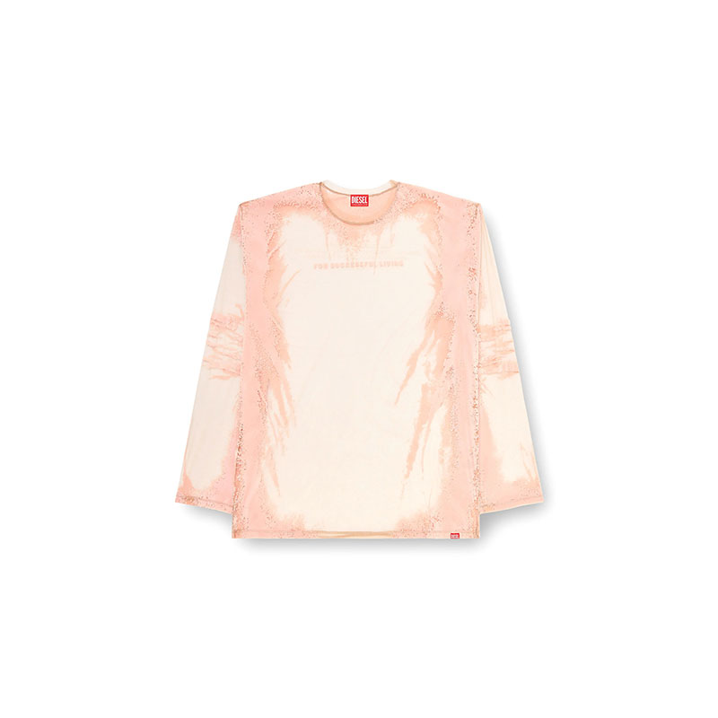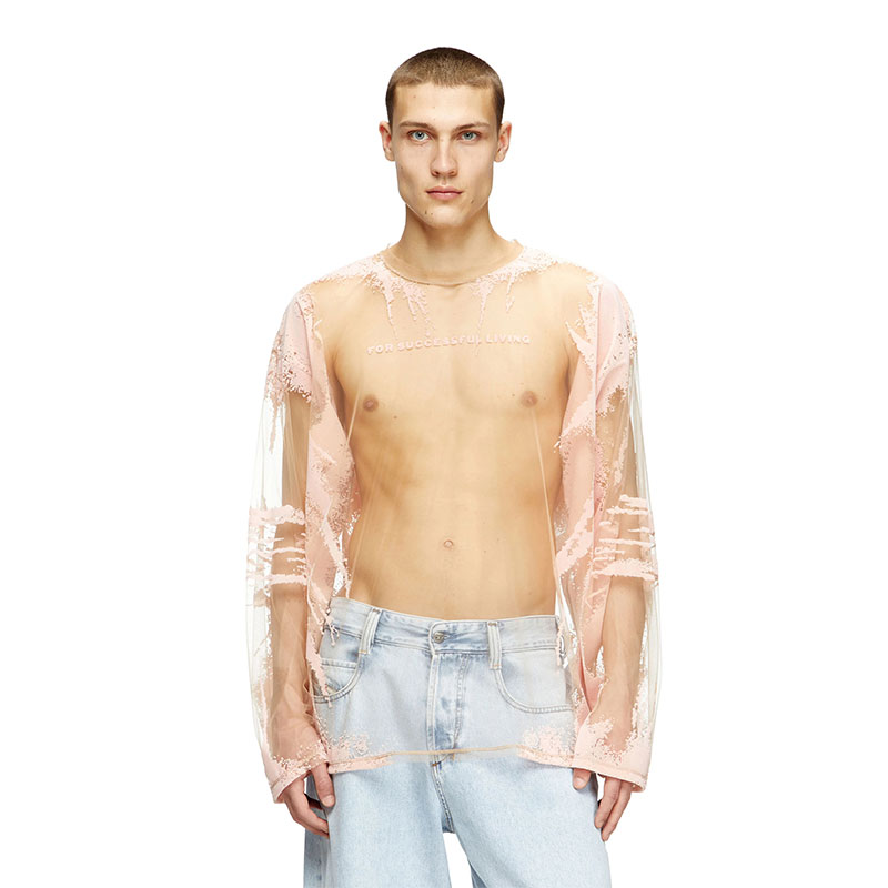Men's long-sleeved T-shirt made from technical fabric designed to be see-through on most of the garment. This crewneck tee is featured in the Remaster collection, a celebration of the underground club scene and Diesel's long-standing alliance with the DJ community. Each piece is printed with custom graphics or quotes chosen by DJs participating in the project as a personal tribute to the music that changed their lives.