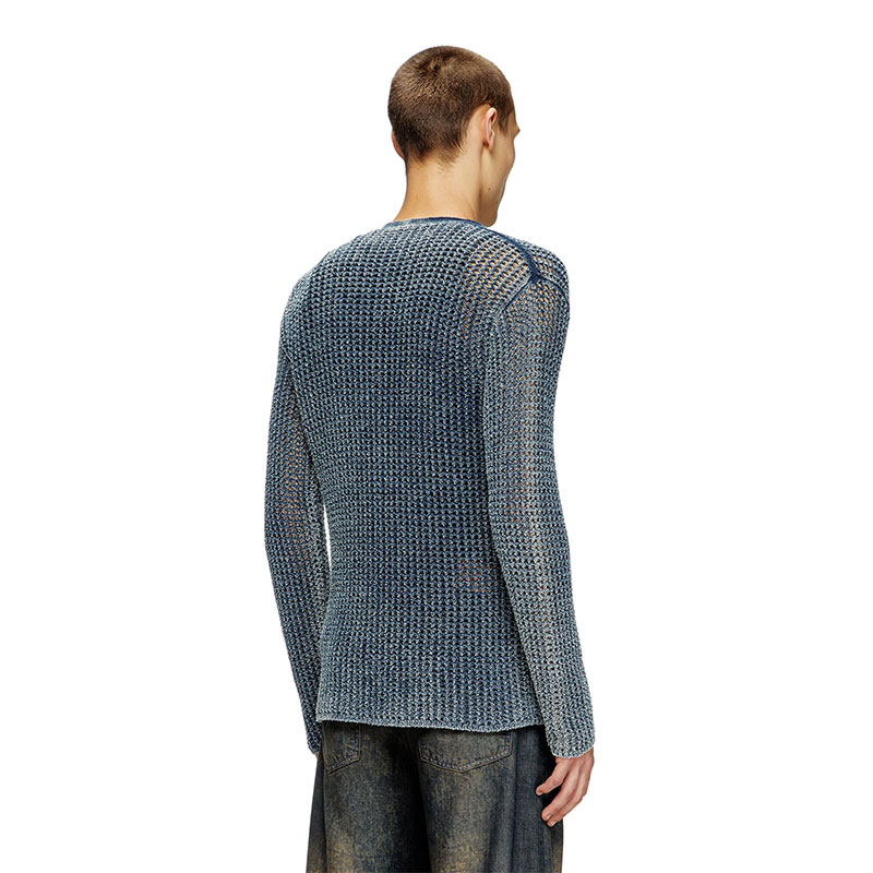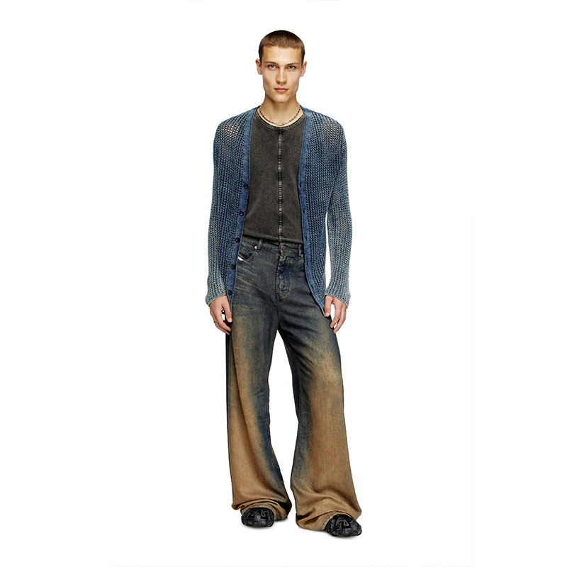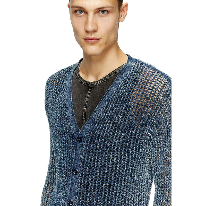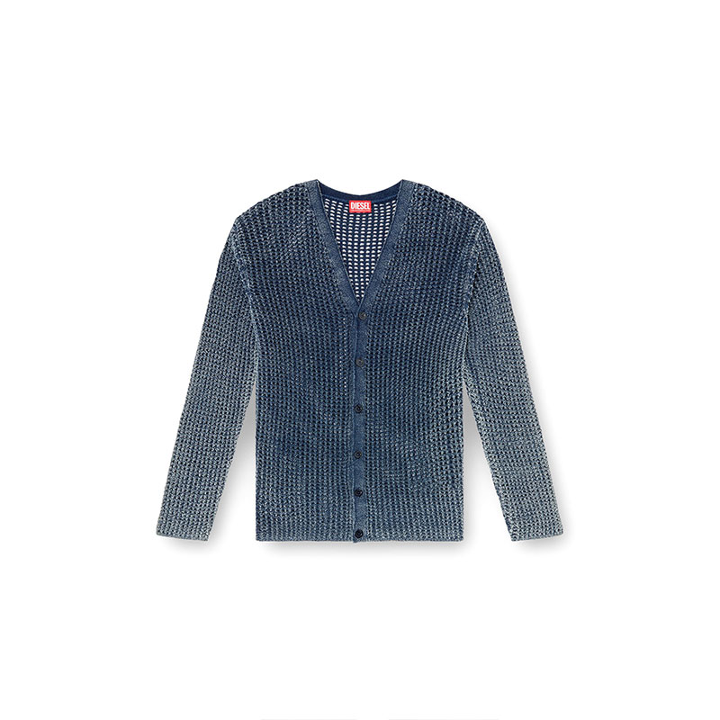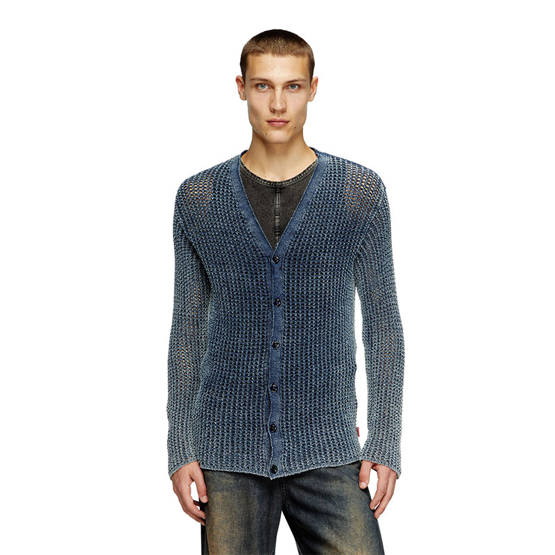 This men's blue cardigan nods Diesel's denim DNA and experimental spirit. Designed for a loose fit, it has a chunky, mesh-like construction knitted from a soft and spongy indigo denim yarn containing a high percentage of organic cotton. A stonewashed finish amps up its lived-in denim vibe.