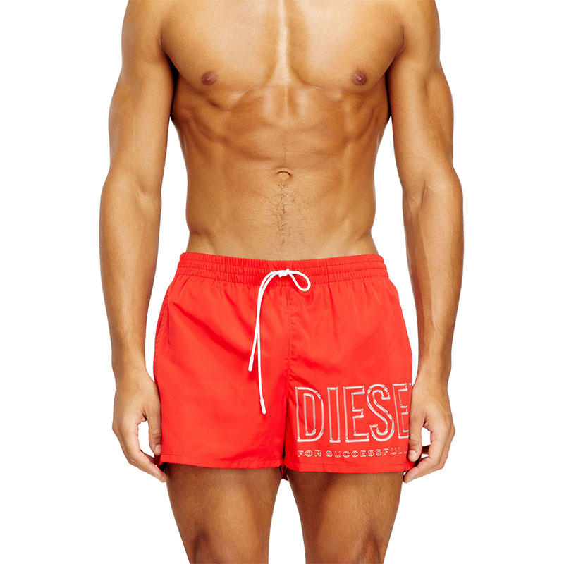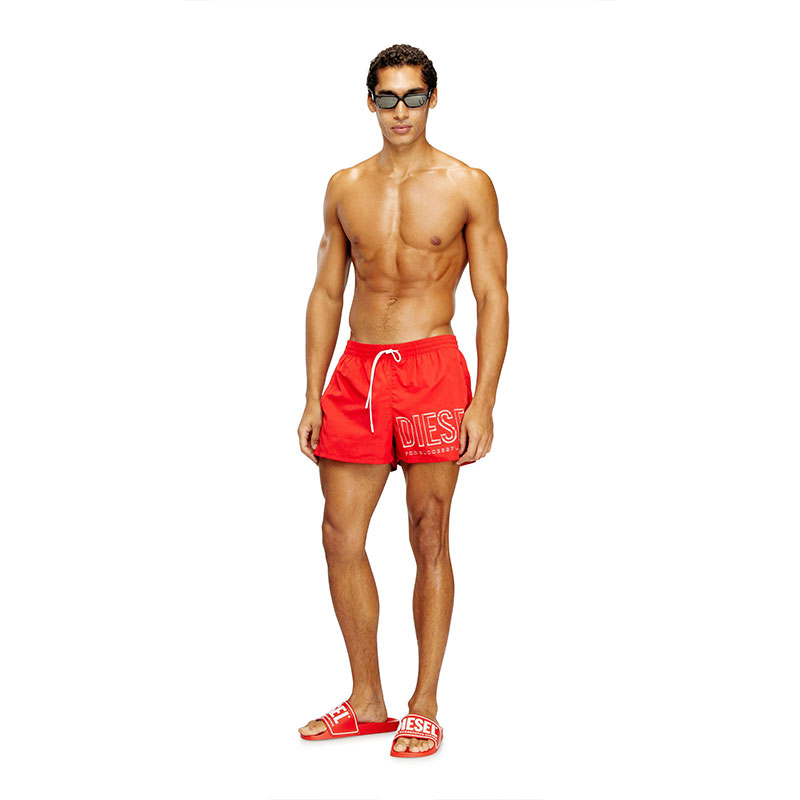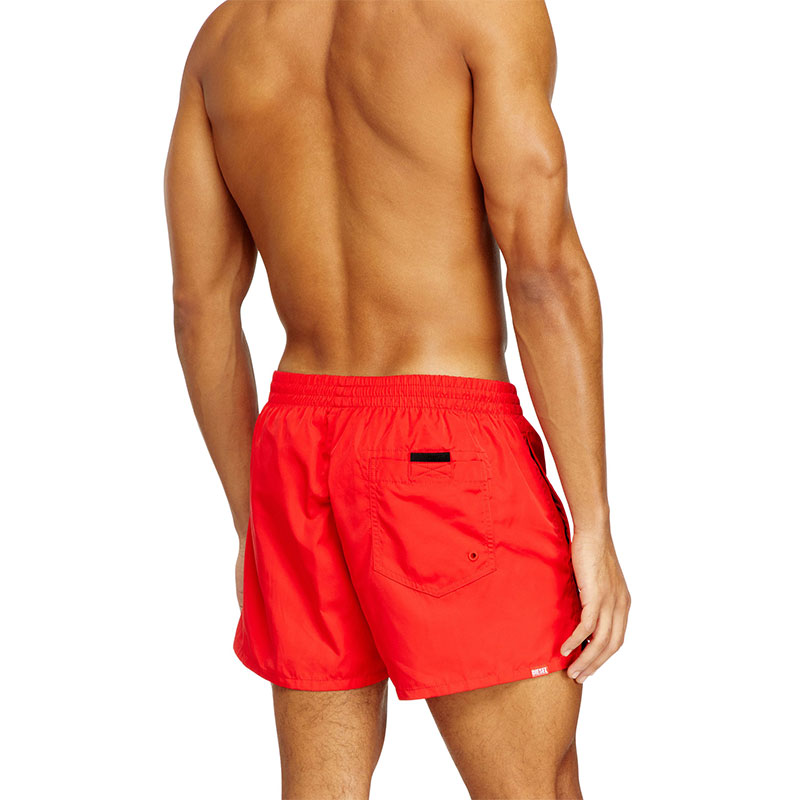 Men's swimming trunks made from recycled polyester, featuring mesh-lined pockets and an inner lining for added comfort and support. The swim shorts feature side pockets and a back patch pocket, an elasticated waistband and contrast drawstring with branded rubber ends. The Diesel logo on the front left leg is printed as an outline.