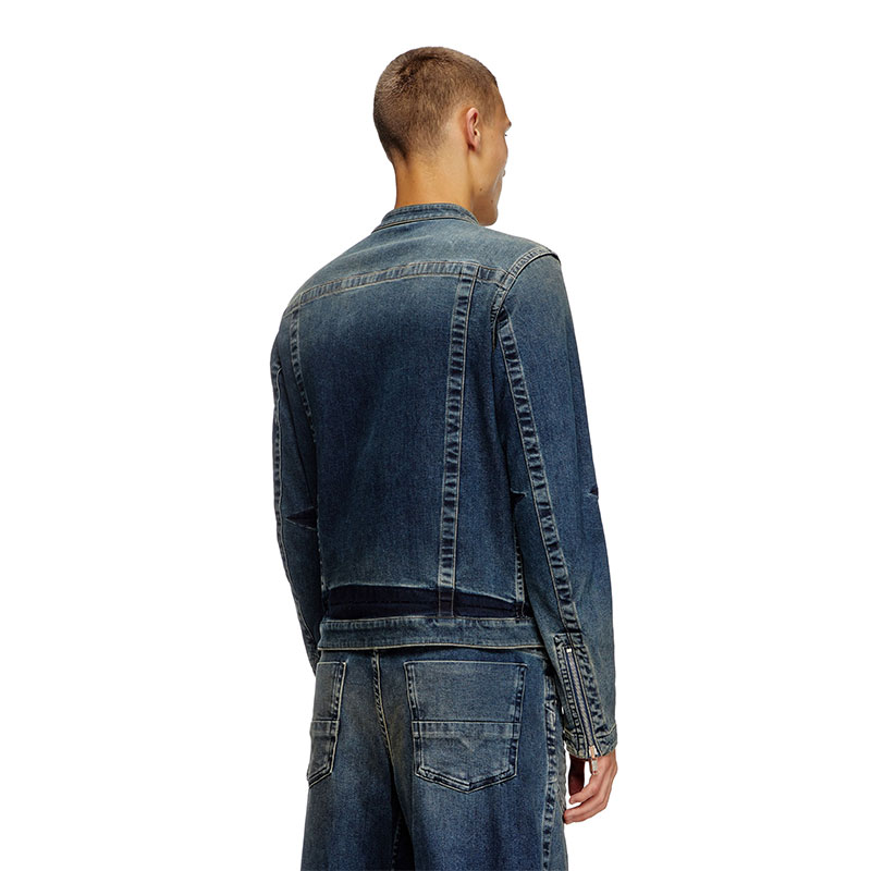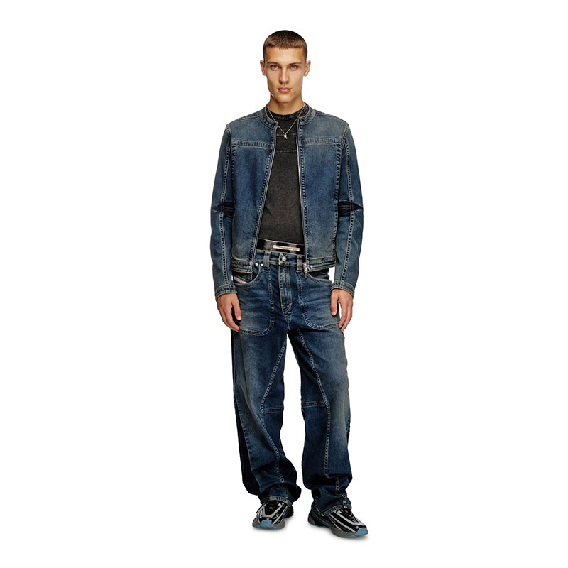 This men's denim jacket updates a heritage Diesel style. Featuring a rounded snap-button collar, metal zip closure and side pockets, it's detailed with branded rivets and bold seams that frame the sporty moto silhouette.