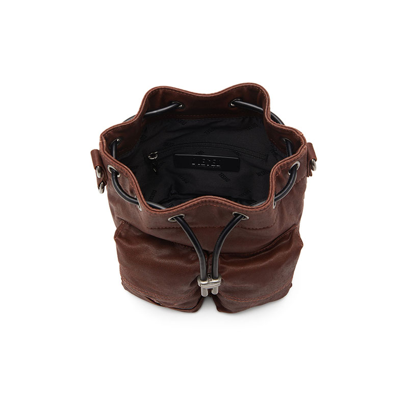 Unisex bucket-style bag with stretch fabric that offers greater versatility. Made of cotton, it features a removable and adjustable shoulder strap for convenience. The drawstring closure adds security. Details include multiple external flap pockets. The logo adds a distinctive touch to the design.