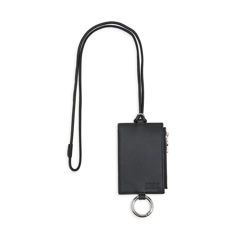 Men's black badge holder crafted from responsible leather. The versatile design features a zipped section, three card slots, and detachable split ring. It's subtly embellished with a tonal matte metal plaque cast in the shape of the iconic D logo.