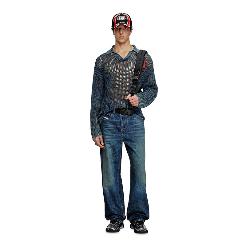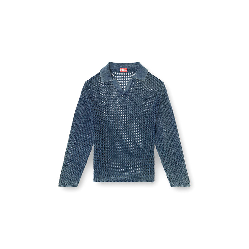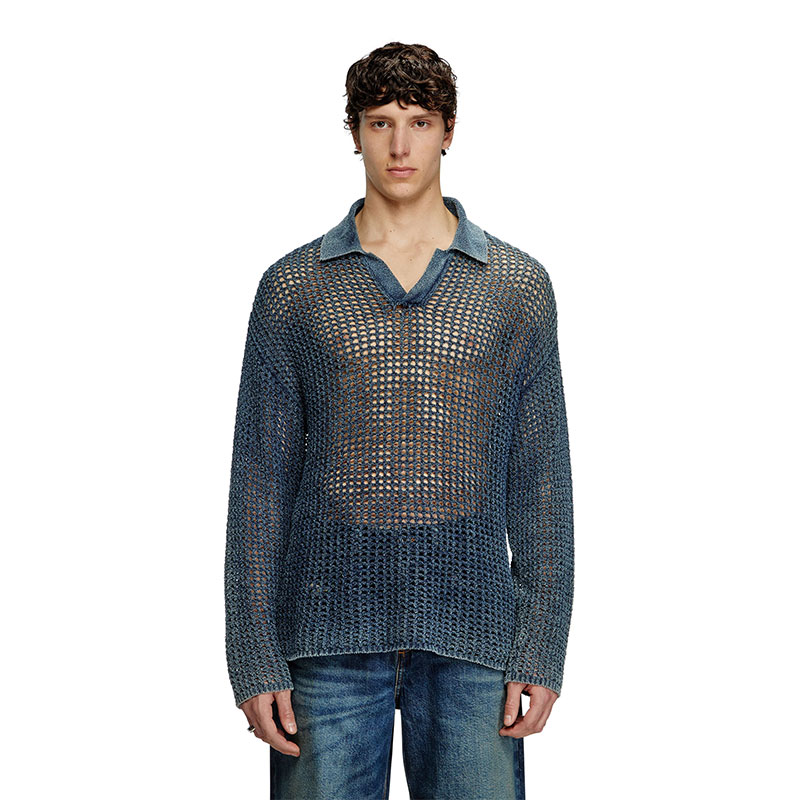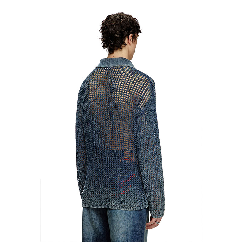 Men's see-through jumper featuring an open polo neckline and a relaxed fit. Crafted from soft and spongy indigo denim yarn containing a high percentage of organic cotton, this sweater is knitted in a chunky mesh stitch and has a subtly faded finish.
