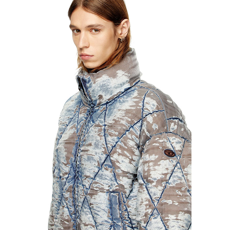 This men’s winter jacket is made from denim with argyle quilting and devoré distressing – the treatment creates areas of sheerness, revealing the garment’s coloured padding. The chunky collar and drawstring-adjustable cuffs and hem help trap heat.