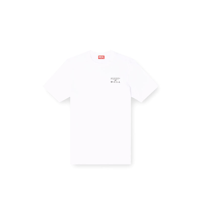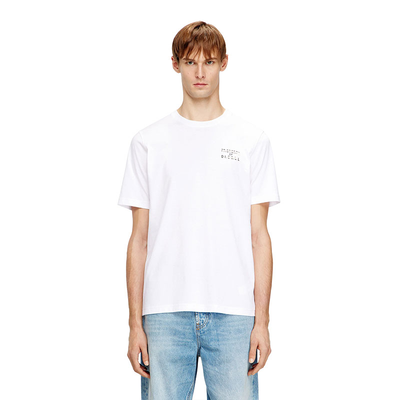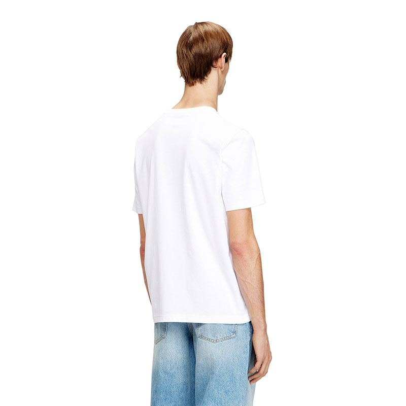 Regular fit T-shirt with crew neck and short sleeves, crafted from light cotton jersey made using organic cotton. The water-based lettering on the chest is enriched by a puff-print "D" detail, and finished with a Diesel flag label positioned on the left side seam.