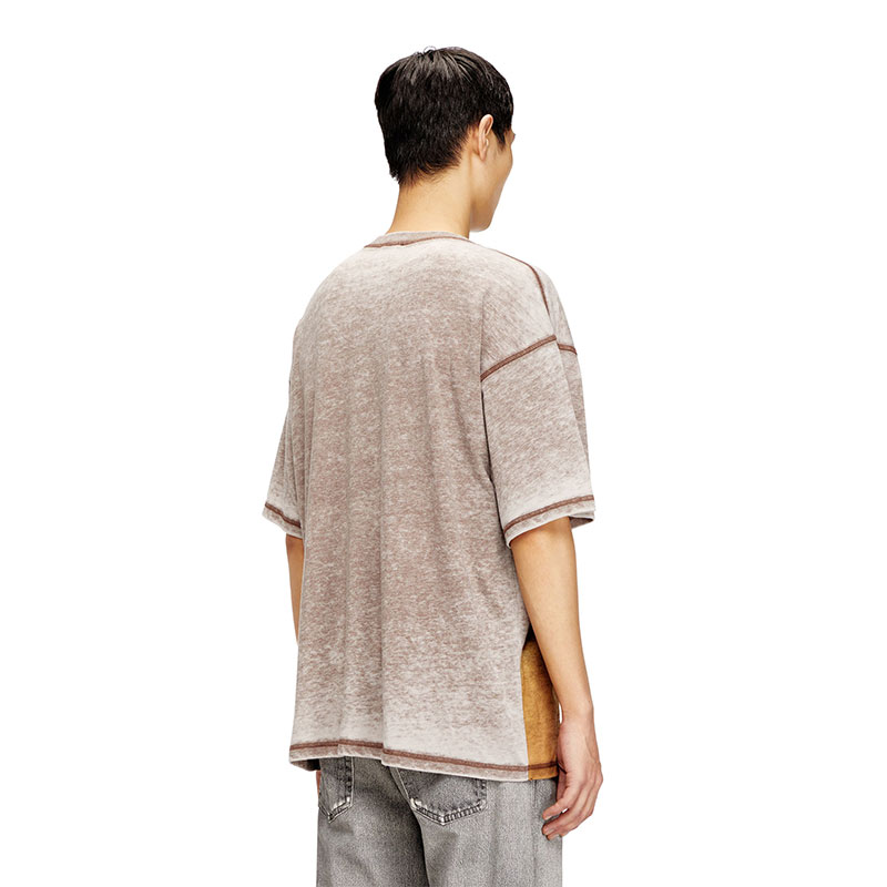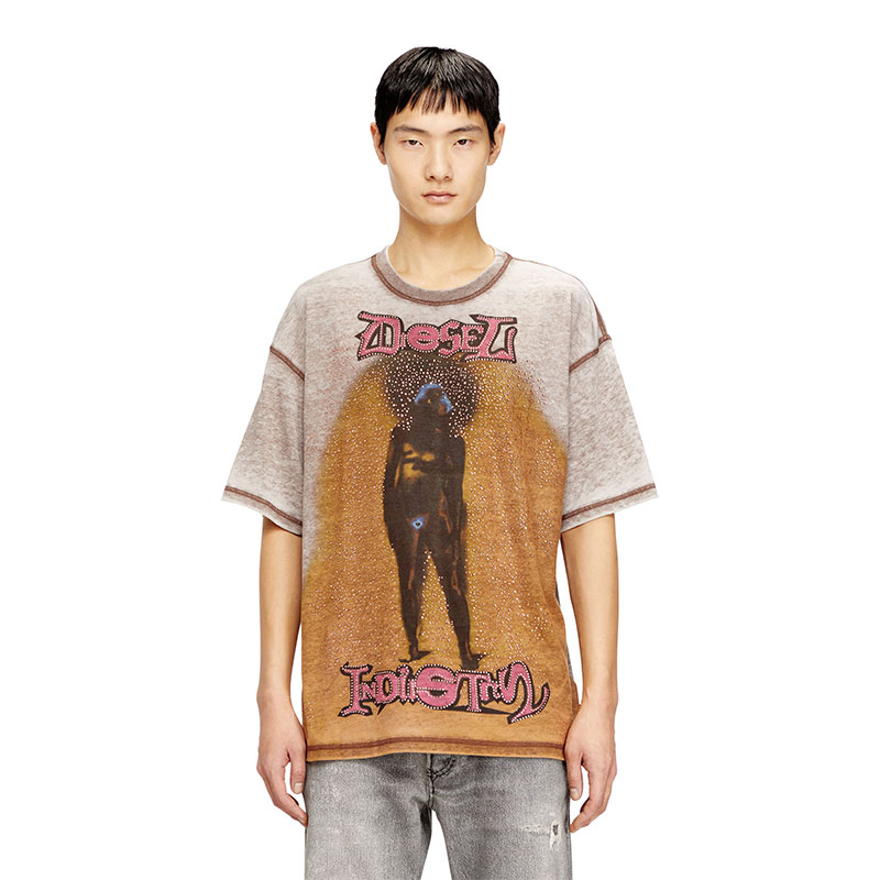 Short-sleeve T-shirt featuring a crew neck and a relaxed fit. Made from cotton-blend jersey, it has a burnout washed effect for a distinctive lived-in look. The design is enhanced by a sublimation print with studs on the front, while the Diesel logo stands out at the top. A small Diesel label is located on the left side seam.