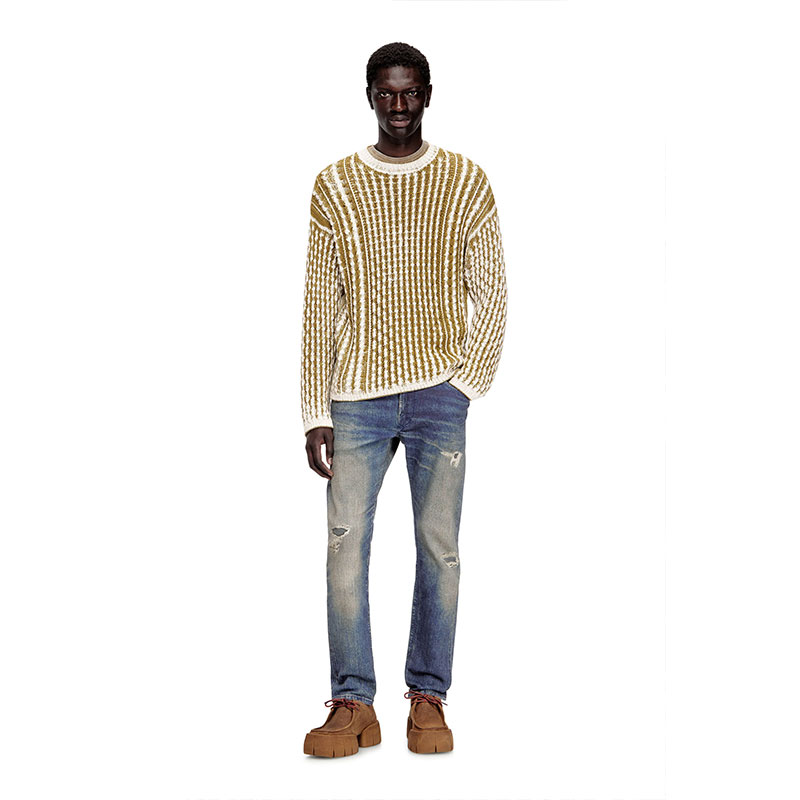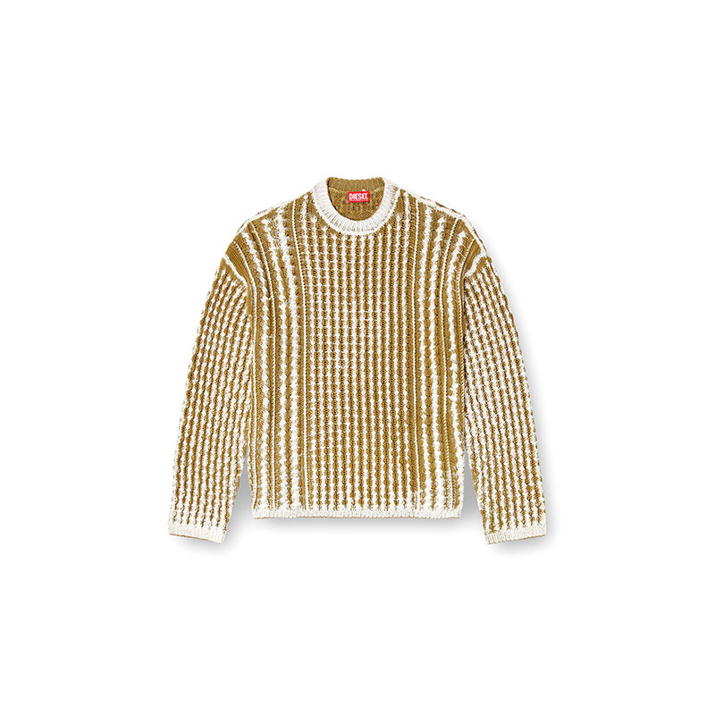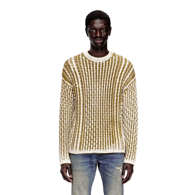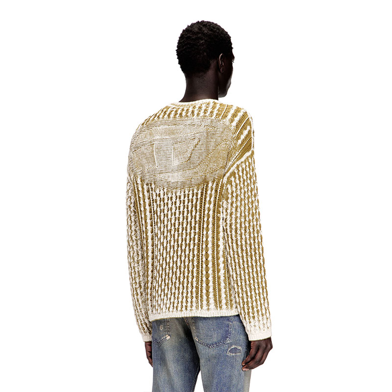 An irreverent spin on classic knitwear, this men’s cotton sweater has a loose-fitting silhouette knitted with cables and a statement-size Oval D logo on the back. A special printing technique on the inside of the garment disrupts the surface with irregular contrasts, making the texture punch harder.