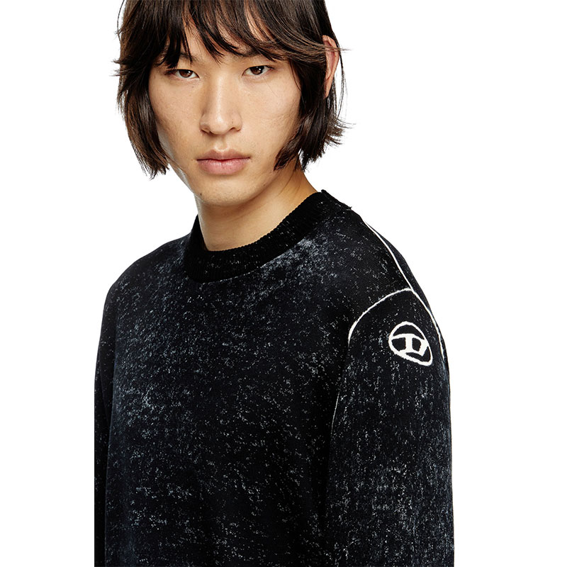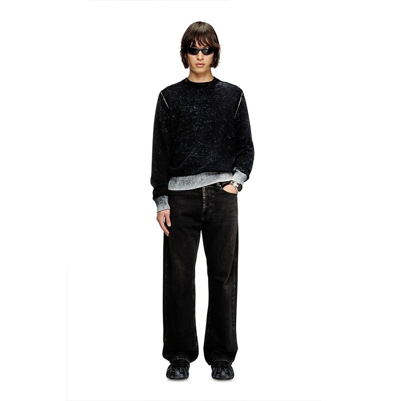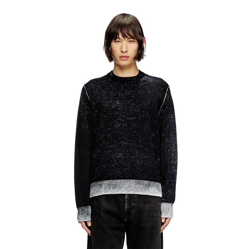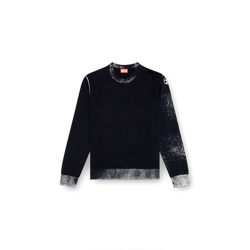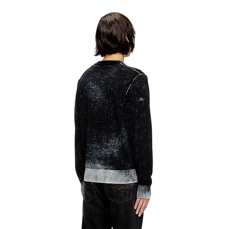 Men's crewneck pullover crafted from smooth gassed cotton yarn. Designed for a regular fit, the jumper has been specially printed on the inside, resulting in a softened, uneven colour. The effect of this technique is particularly visible on the ribbed trims and sleeves, where the tone is decidedly lighter.