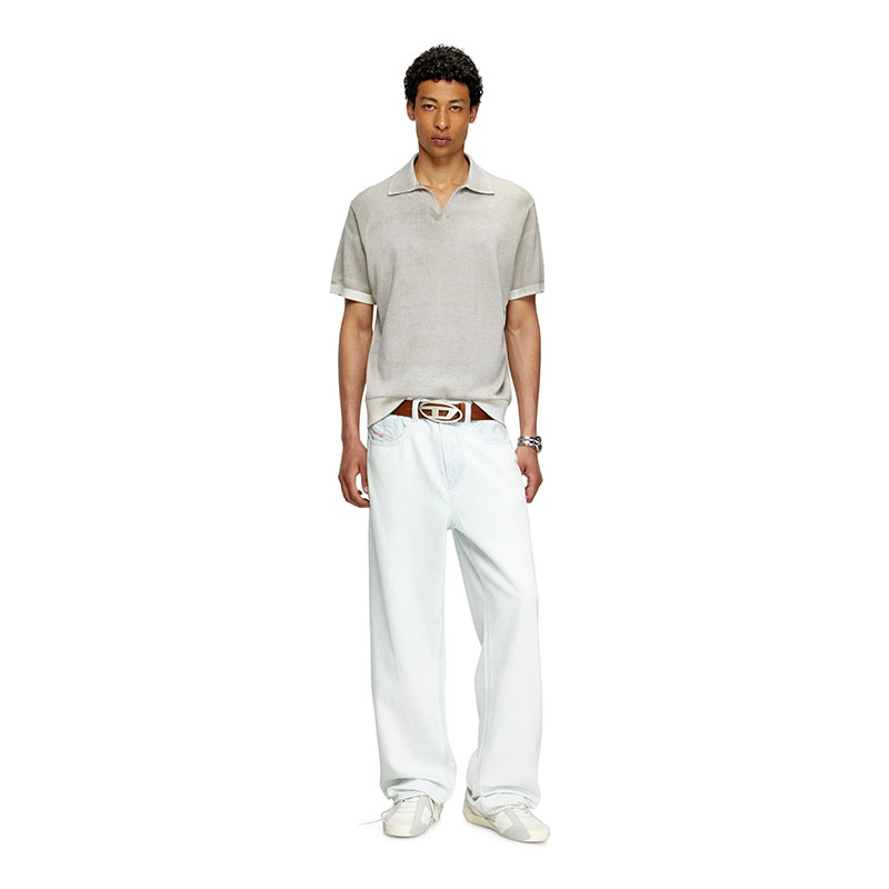 Men's knit polo in smooth gassed organic cotton. Featuring a relaxed open collar and short sleeves, this sweater has been specially printed on the inside, creating unique, irregular colouring on the outside. The effect of this technique is particularly visible at the ribbed trims, where the tone is decidedly lighter.