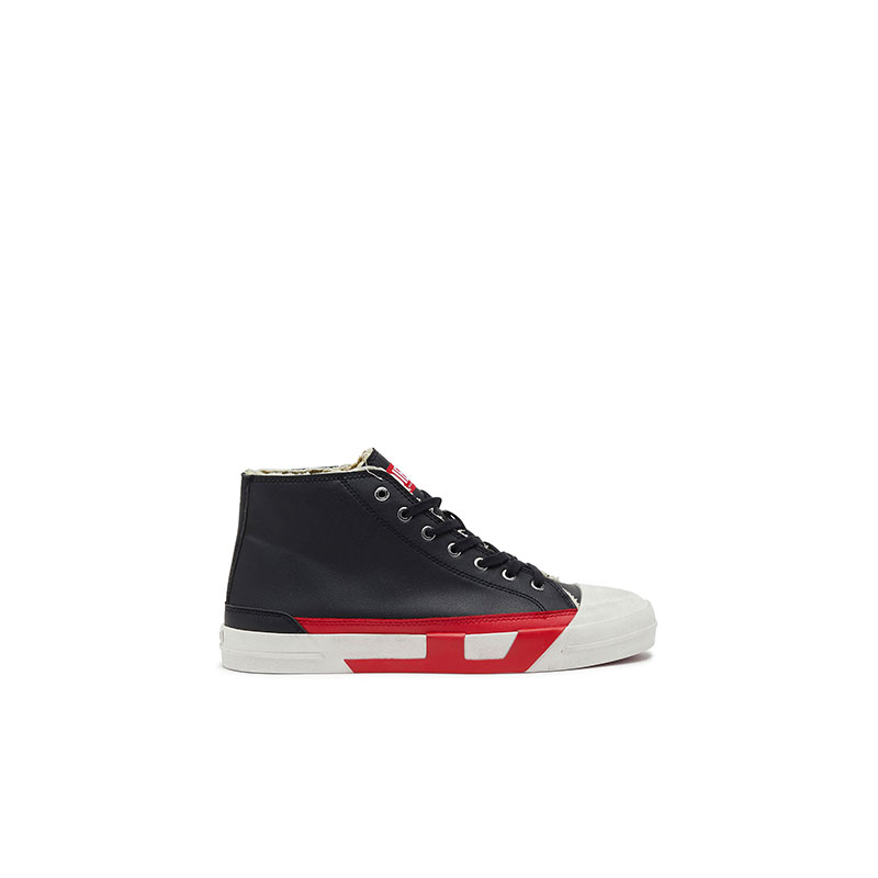 These high-top sneakers feature raw edges and a distinctive D logo displayed on the side, crafted with contrasting inserts on the upper and sole. Branding includes a woven label with the Diesel Biscotto logo on the tongue, and a small rubberized Diesel branding patch on the back of the heel. The rubber sole is subtly textured.