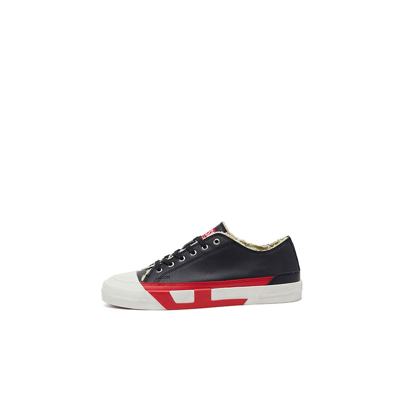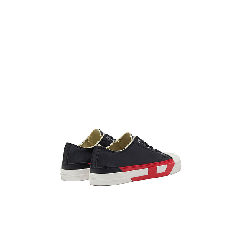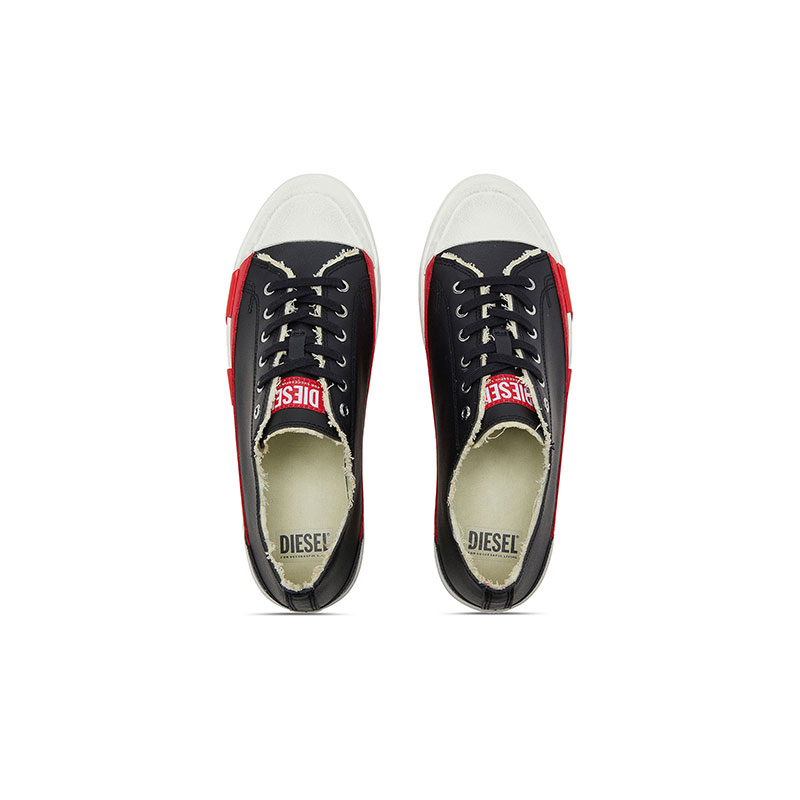 Vulcanized sneakers featuring a low and sturdy upper with raw-cut edges and a grained texture. They have the logo on the tongue and a lace-up closure with metallic eyelets. The slightly elevated midsole gives a bold look, also thanks to the contrasting inserts that outline the letter D.