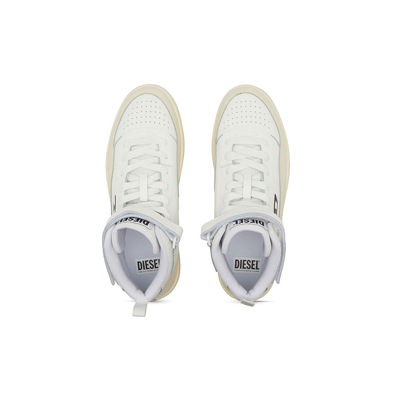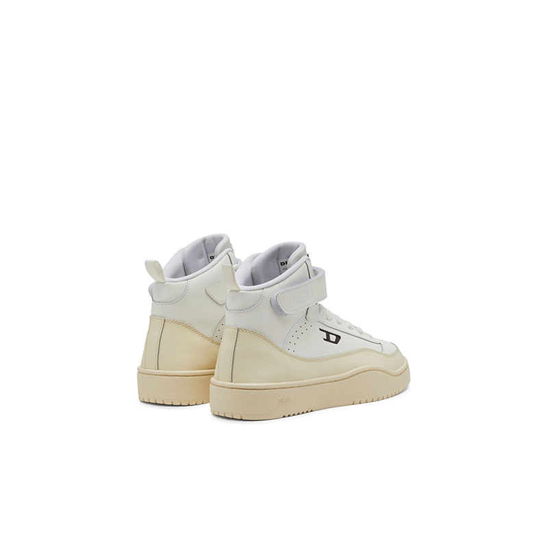 Men's mid top sneaker made of soft calfskin leather with avant garde details. The nineties inspired upper has a classic silhouette, with contrasting Diesel logos on the tongue at the side. A tonal Diesel logo also features on the velcro ankle strap. The chunky rubber sole has a custom tread.