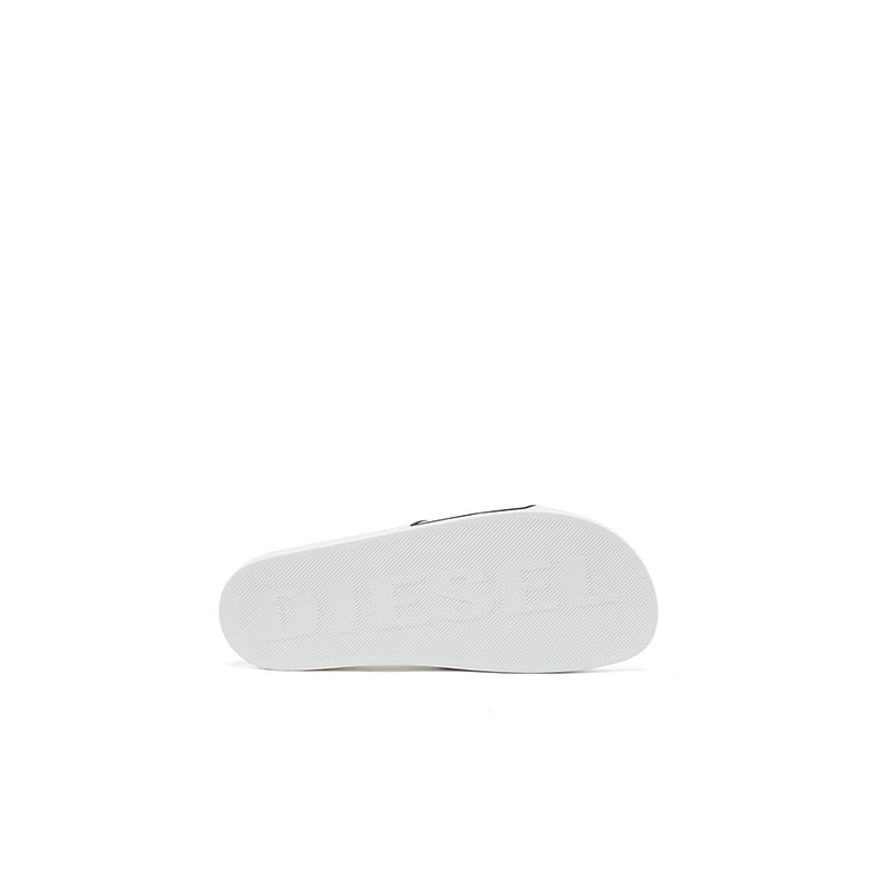 These pool slides are styled with moulded footbeds and gripped logo soles. The wide upper band is branded with a 3D Diesel For Successful Living logo and trim.