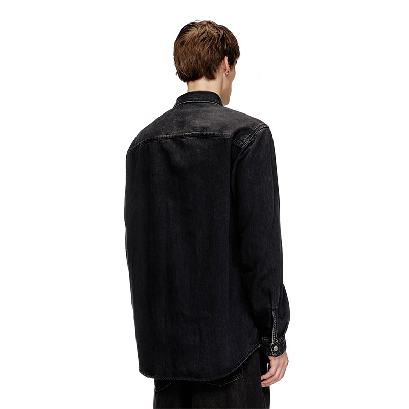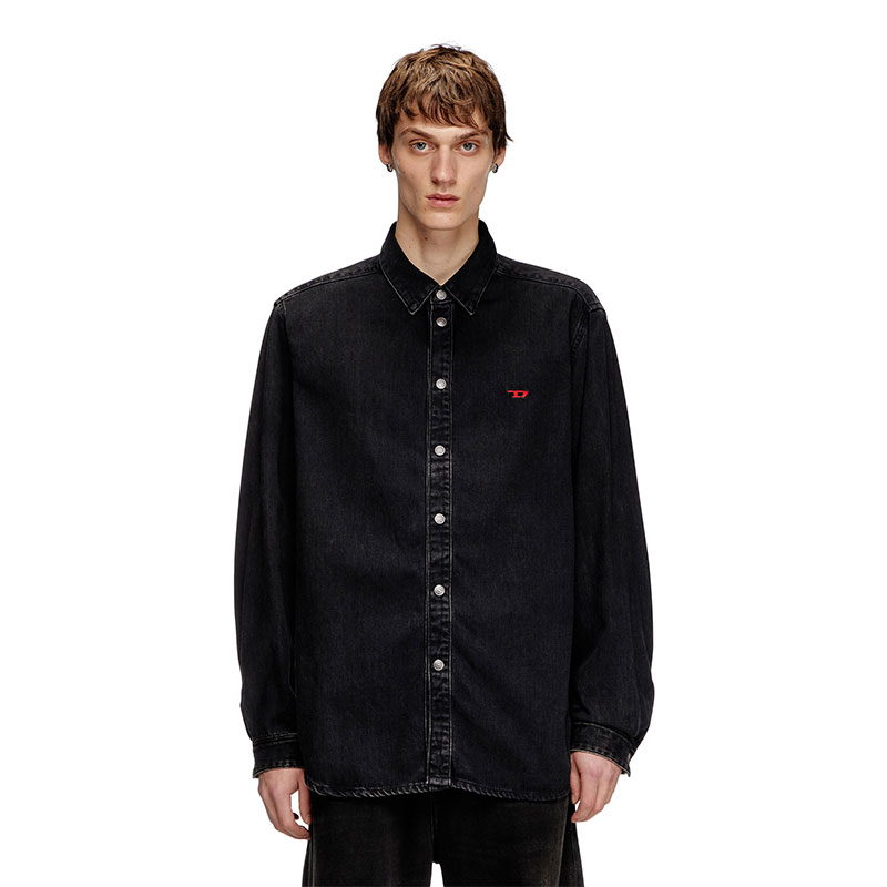 Men's jean shirt cut to a regular fit. It features a clean construction with essential details and a red D logo embroidered on the chest. Crafted from black TENCEL Lyocell denim with subtle treatments.