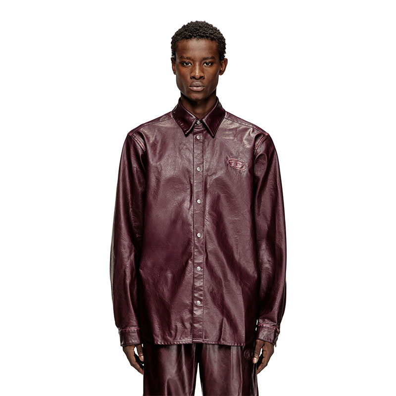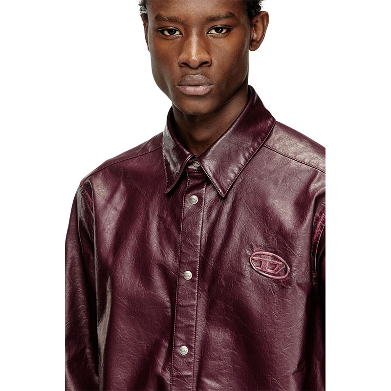 Men's regular fit shirt, crafted from burgundy coated fabric, offering a unique, smooth texture that feels a bit like leather. The clean, essential construction is enriched with branded press buttons at the front.