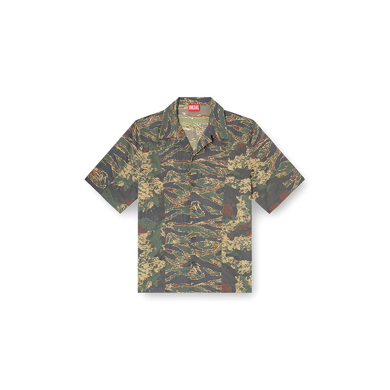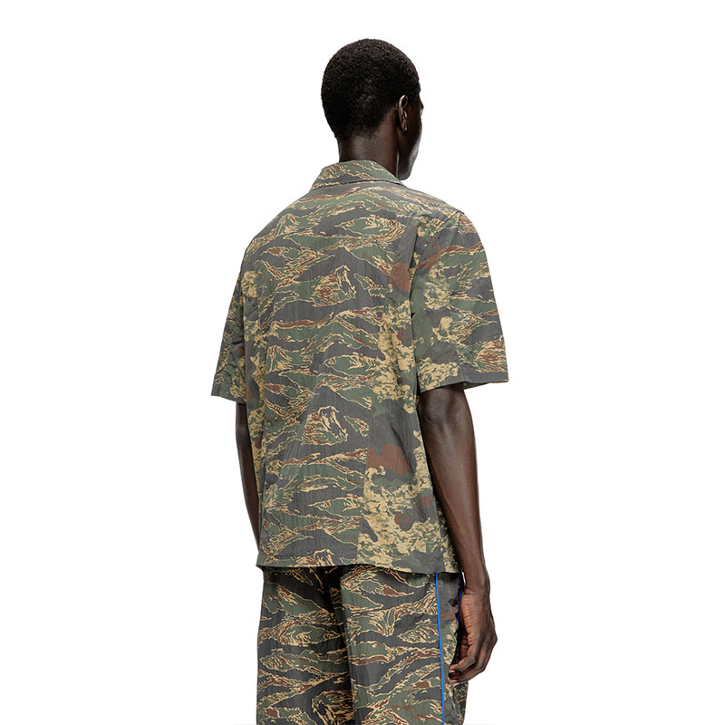 This short-sleeve men's shirt is built from light recycled nylon with a tactile wrinkled feel. Its regular-fitting silhouette is pieced together from panels with mixed prints for a quirky take on classic khaki camo. An embroidered D hallmarks the sleeve.