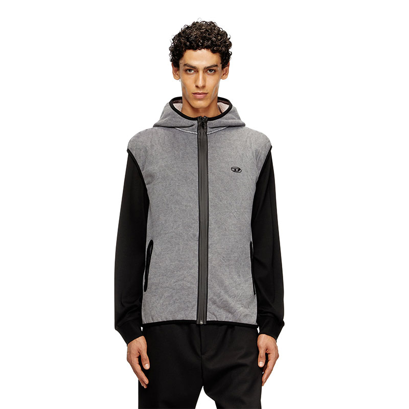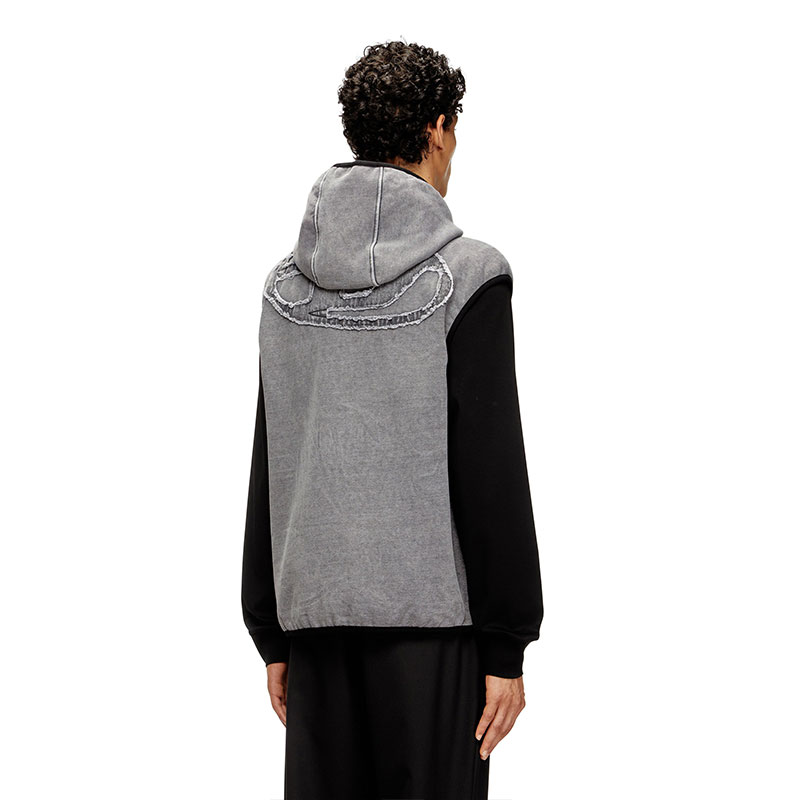 Sleeveless hoodie with a comfortable fit, thanks to the stretchy component. Made of indigo fleece fabric and with a teddy interior, it underwent an acid washed treatment for a worn effect. It features durable lycra edges on the front pockets and the front closure is a heat-sealed zip. The logo is double: on the front left side, there is a small thermo-applied embroidery while on the back there's a large Oval D logo in denim.