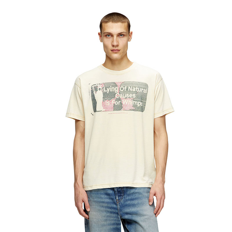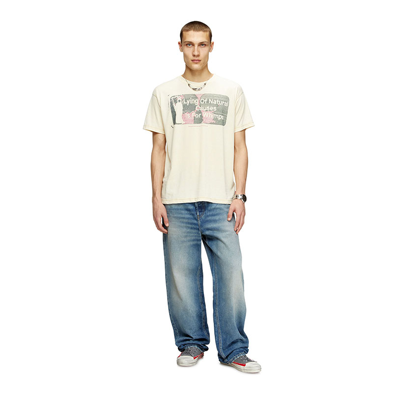 Part of an artistic collab, this men's T-shirt is printed with artwork featuring a playful spin on the slogan 'Dying of natural causes is for wimps' – note the silhouette of a grim reaper wielding a scythe. It's cut from jersey to a regular fit and finished with a burnout wash for a lived-in look.