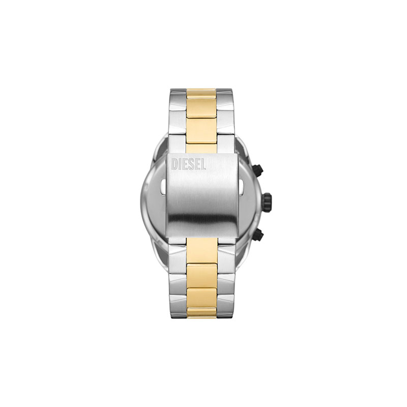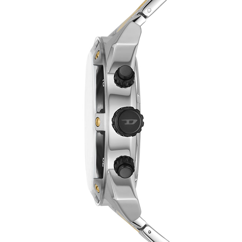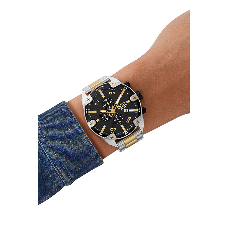Diesel's 49mm Spiked watch features a black satin dial, chronograph movement and two-tone stainless steel bracelet.