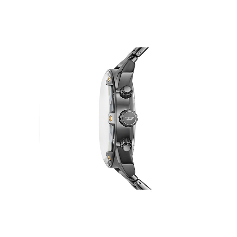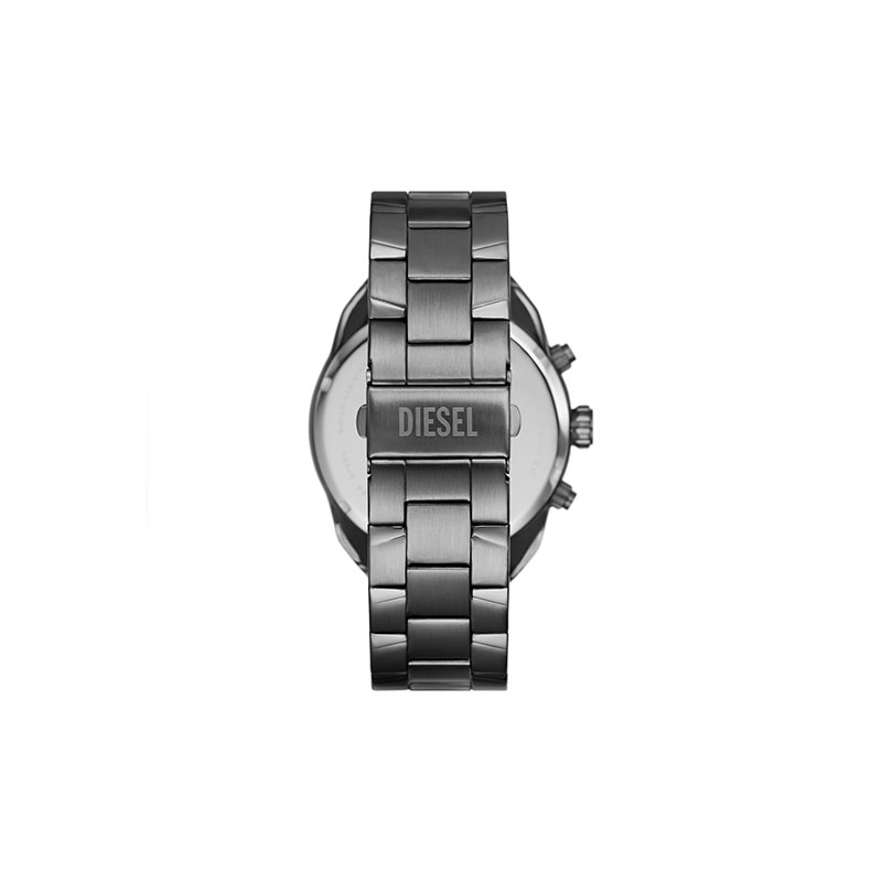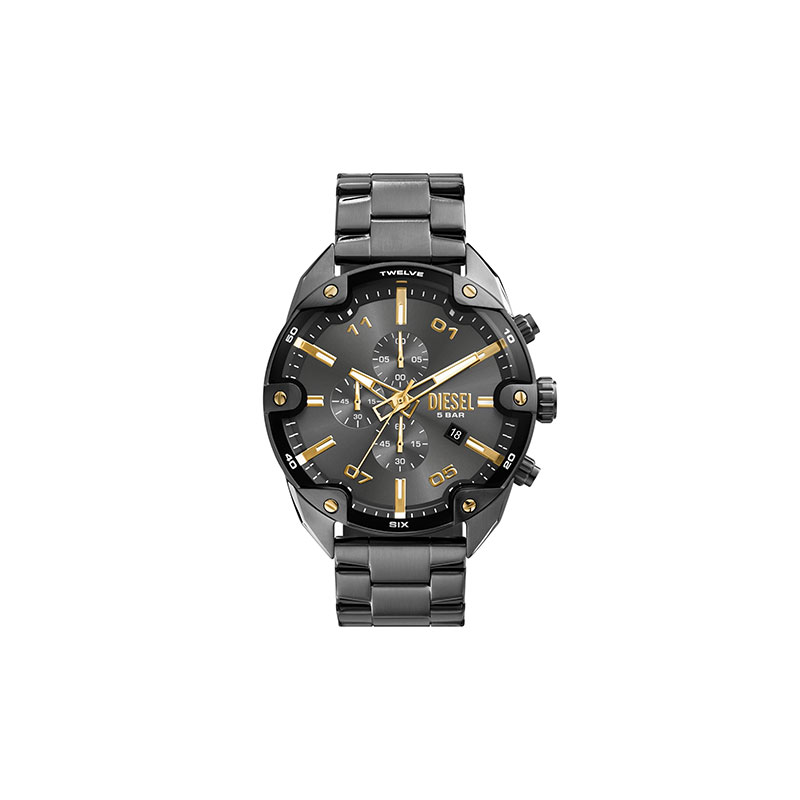 Diesel's 49mm Spiked watch features a gray sunray dial, chronograph movement and gunmetal stainless steel bracelet.