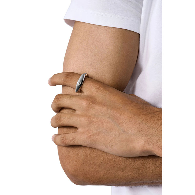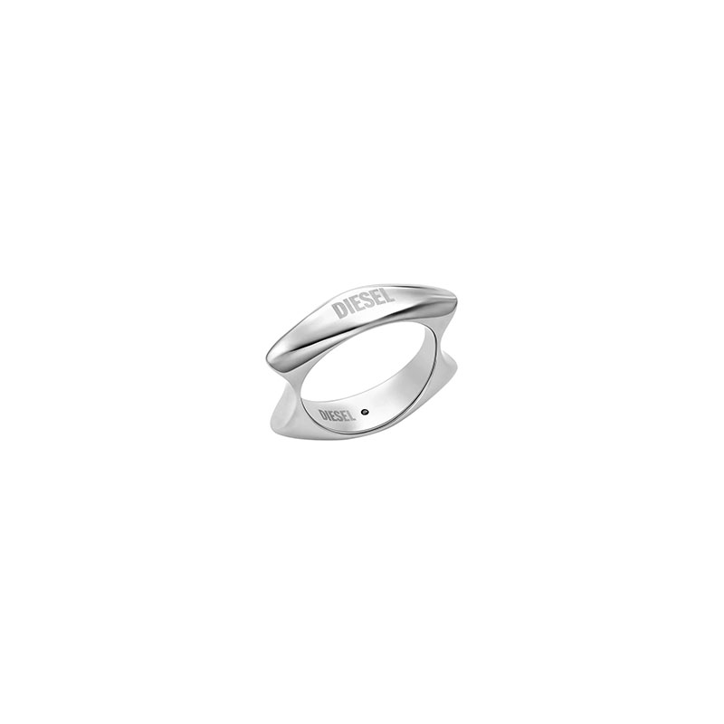 Diesel's stainless steel band ring ties into the organic language of the Metamorph watch collection. Offered in a silver color, this ring features the Diesel Font logo and a unique curved shape.