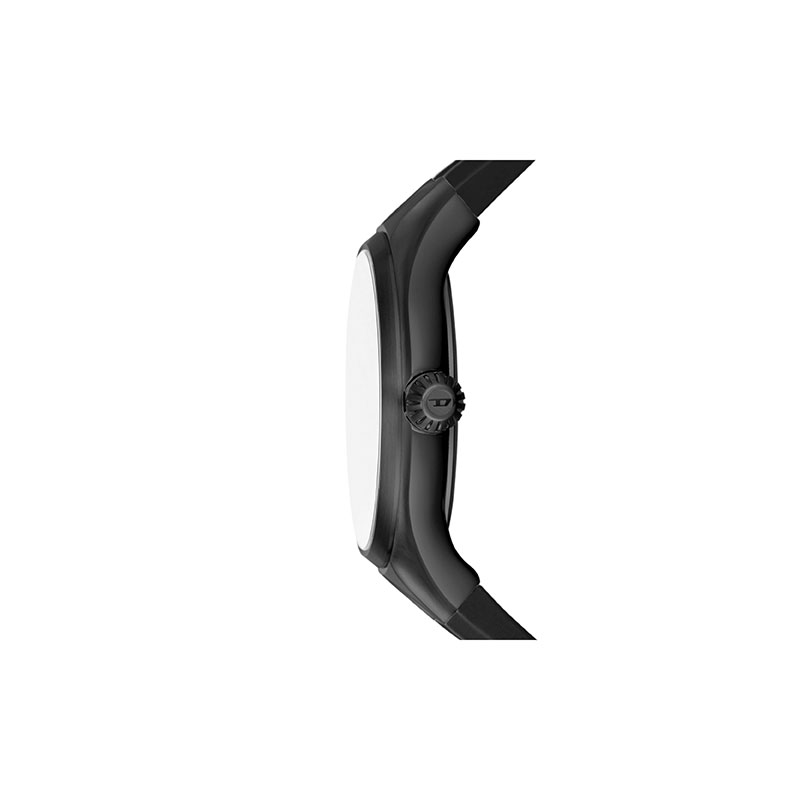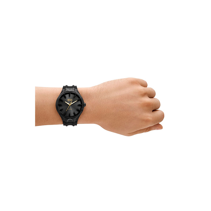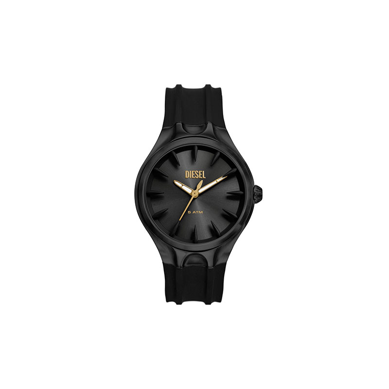 Diesel's 44mm Streamline watch features a black sunray dial, three-hand movement and black silicone bracelet.