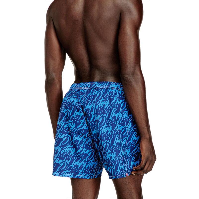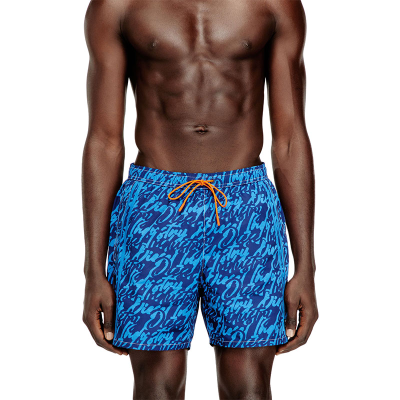 Medium-length swimming trunks made of recycled nylon with mesh pocket lining. The shorts feature an all-over graphic print that interprets the Diesel logo in fluid lettering. Complete with a contrasting drawcord with branded rubber tips, a signature rubber eyelet at the center front, and two solid side stripes for a sporty twist. A DSL patch is embroidered at the front left hem.