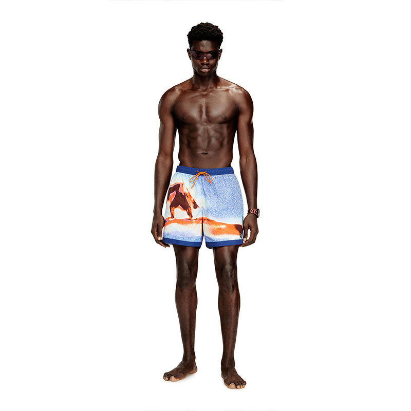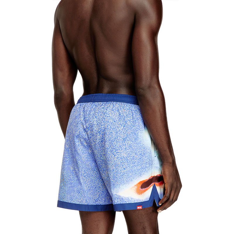 These medium-length men's beach shorts are made from recycled nylon with mesh-lined pockets. The swim shorts feature an all-over surfboard print, contrast waistband and hem, and a drawcord with branded rubber tips. Complete with a DSL logo embroidery patch at the front left hem and a rubber logo eyelet at the front.