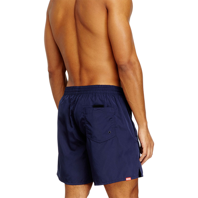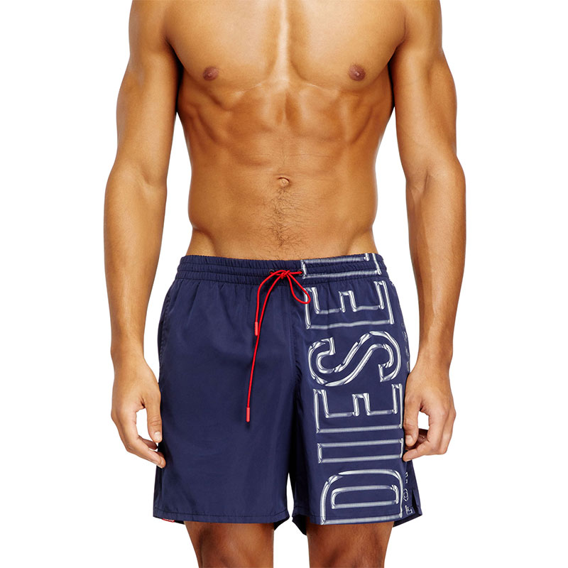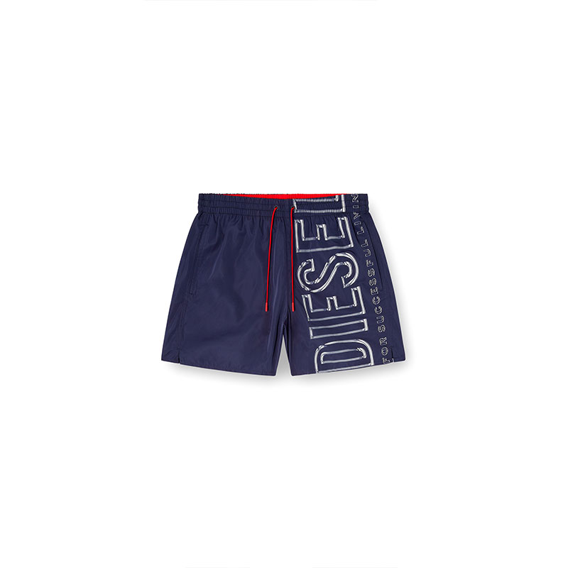 Beachwear boxer shorts made from recycled polyester fabric with a mesh lining and a comfortable elastic waistband, featuring a contrasting drawcord with branded rubber tips. Fitted with side pockets and a back flap pocket, the style is characterised by a striking vertical logo print with a fluid look.