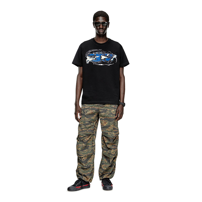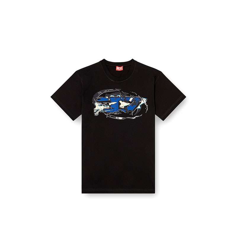 This men's T-shirt is built for a regular fit from organic cotton jersey. The front print is an edgy take on the classic Oval D logo, rotated and layered to create a glitchy, broken-up effect with tactile flocked parts.