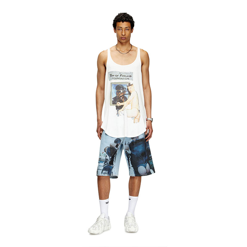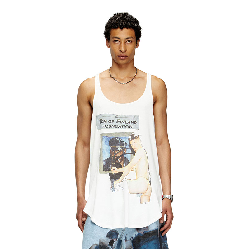 Long tank in lightweight ribbed jersey, cut in a relaxed silhouette with a deep scoop neck and a rounded hemline. Part of a special Pride capsule created in partnership with Tom of Finland Foundation, this genderless top features a printed depiction of artwork selected from the Foundation’s vast collection of queer erotic art, amplifying the importance of self-expression and sexual freedom. Take a closer look at the herringbone tape on the back to see the inspiring message from the Foundation’s legendary namesake artist Tom of Finland.