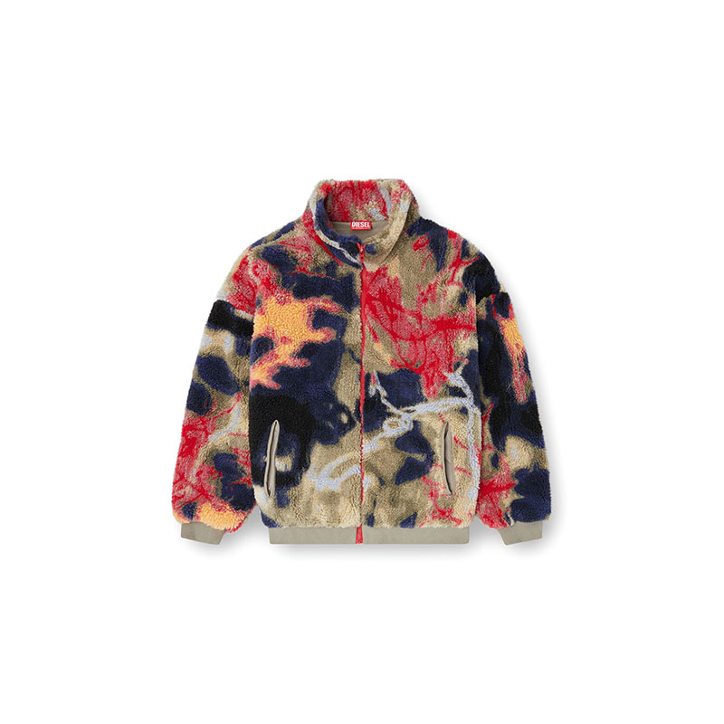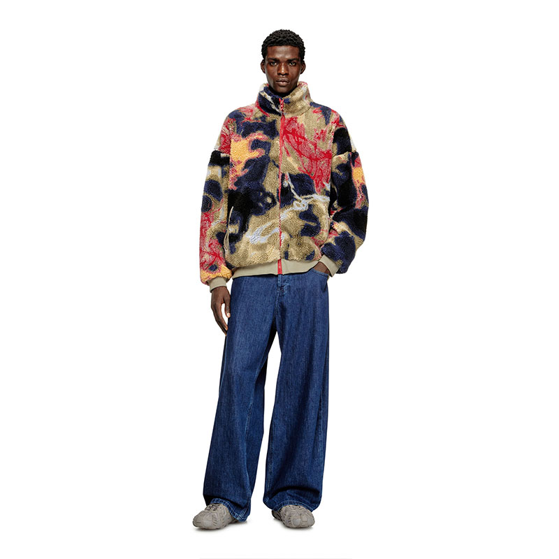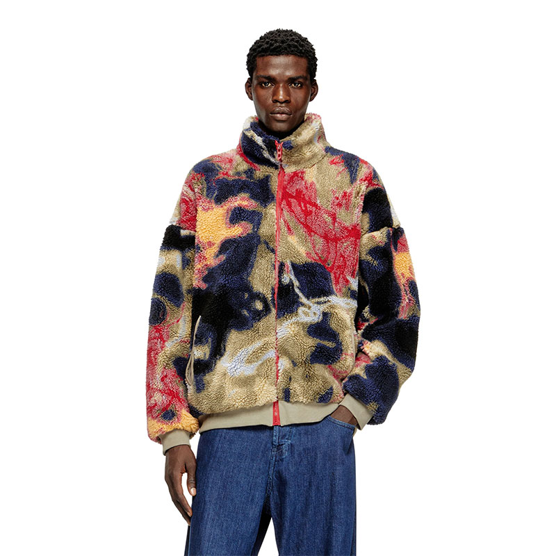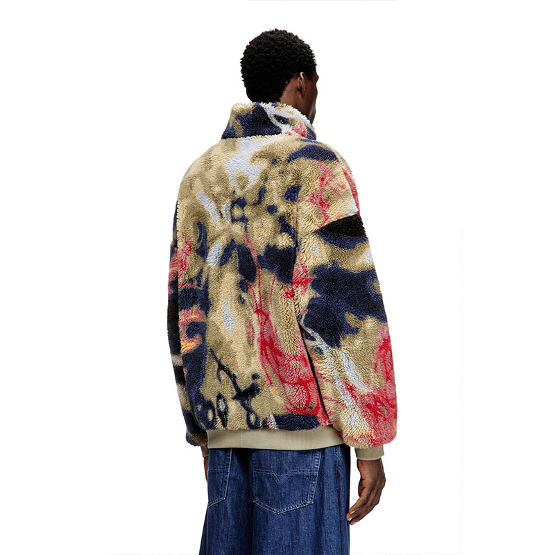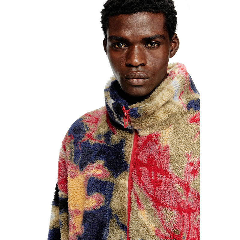 Street edge, wrapped in comfort. This men’s teddy jacket comes in fluffy jacquard fleece, lit up with colourful artwork inspired by graffiti. The silhouette is easy and relaxed, framed by the high neck solid ribbed trims. A lined interior that keeps the fit smooth.