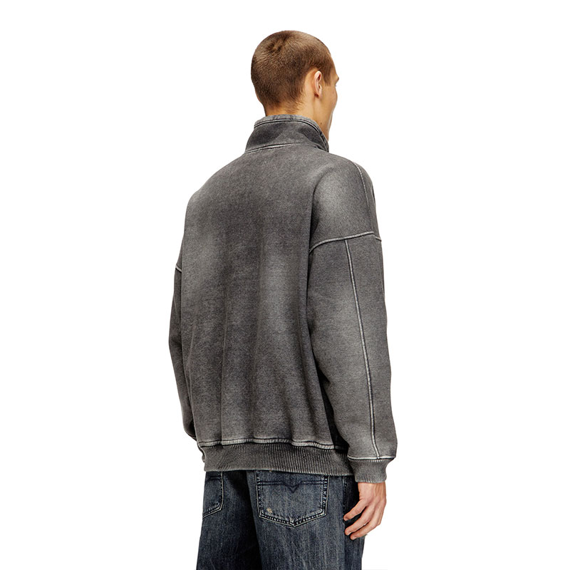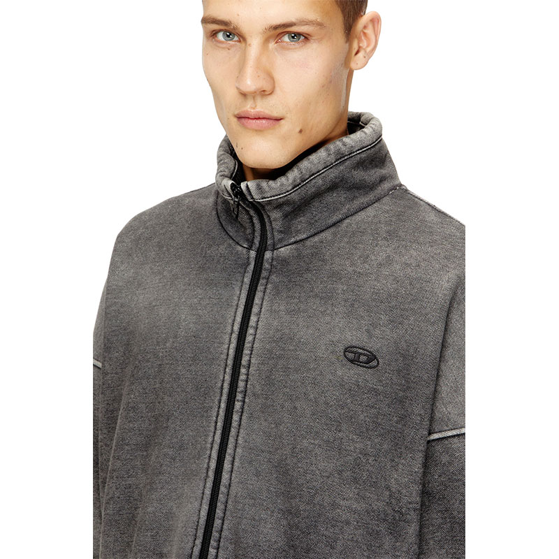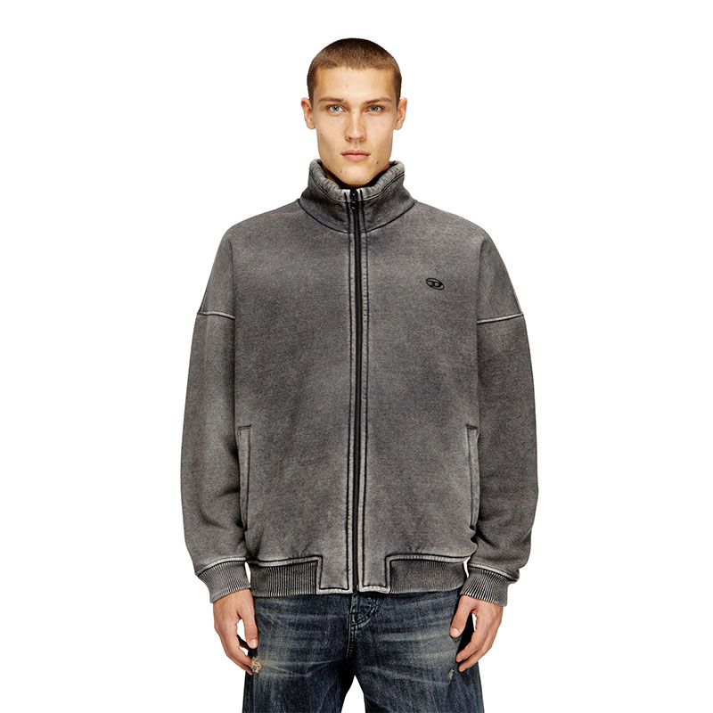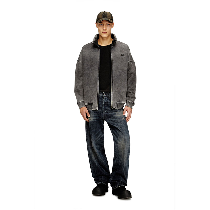 This men’s full-zip jacket nods to Diesel’s denim DNA. The indigo-dyed sweatshirt outer is faded to mimic stonewashed denim and bonded to teddy fleece, ensuring cosy insulation. The silhouette has a funnel neck and comfortable ribbed trims. Finished with an embroidered Oval D logo on the chest.