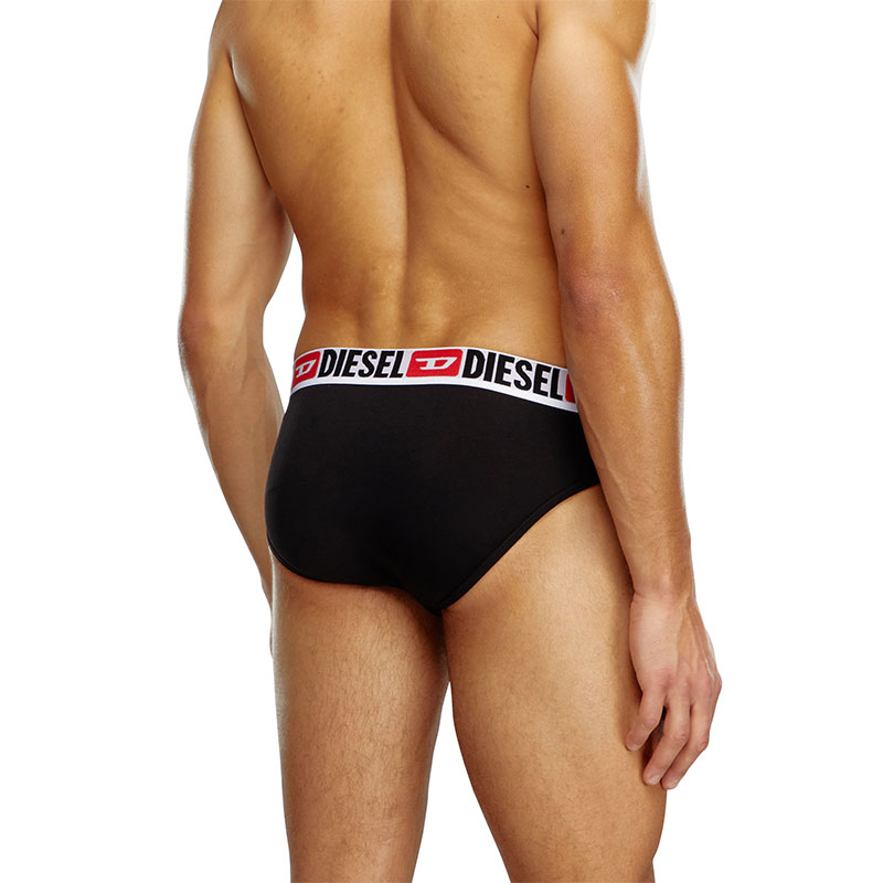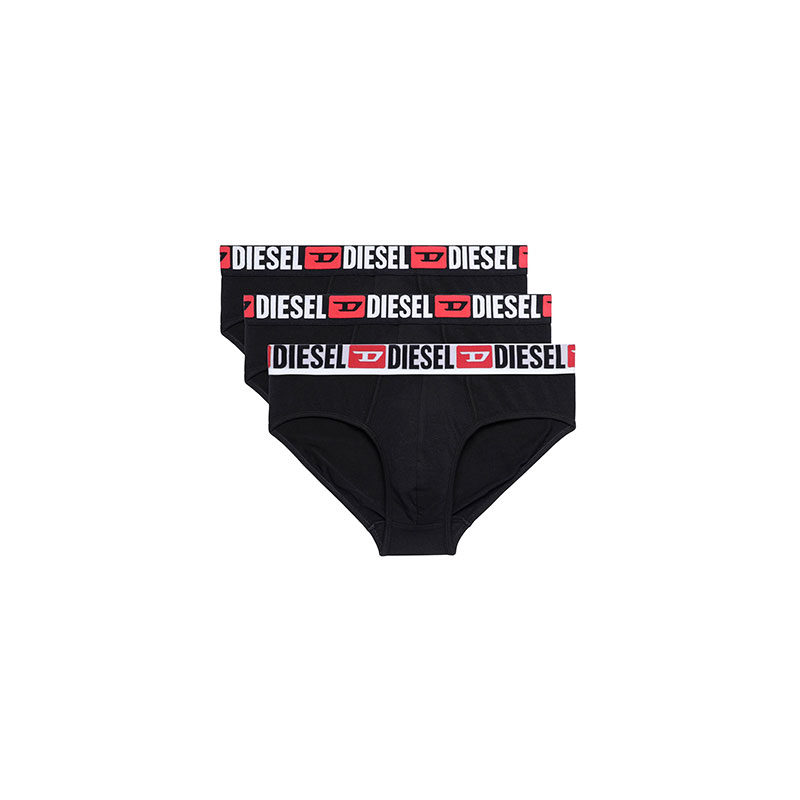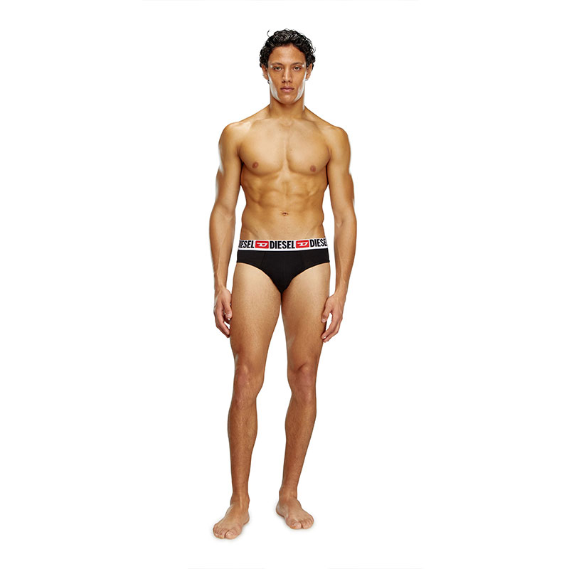 Three-pack of briefs in stretch cotton. The soft jacquard waistband is woven all-over with the Diesel logo and Denim Division D emblem.