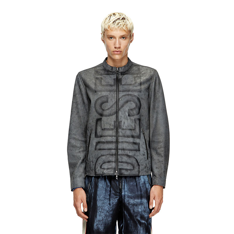 Men's biker jacket with a regular-fit racer silhouette. Crafted from responsibly sourced leather, this treated style has an irregular, marbled appearance and a faded out Diesel Superlogo blasted vertically down the front. It's lined for comfort and detailed with chunky zipped hardware with D logo pulls.