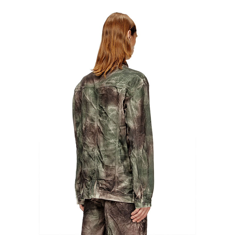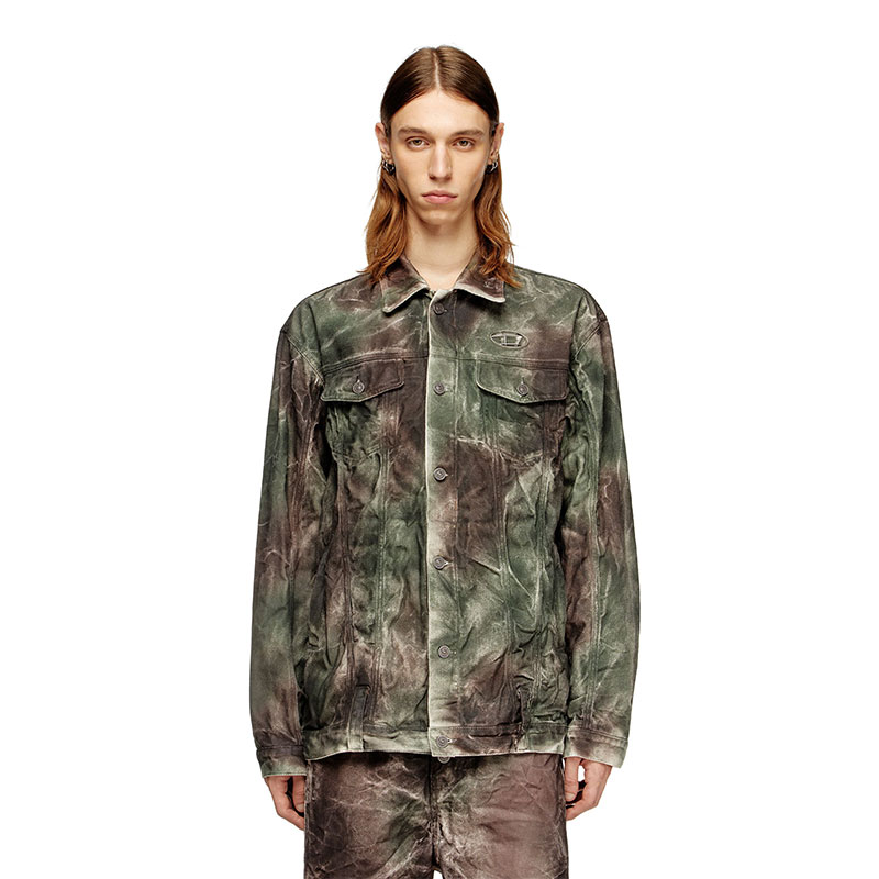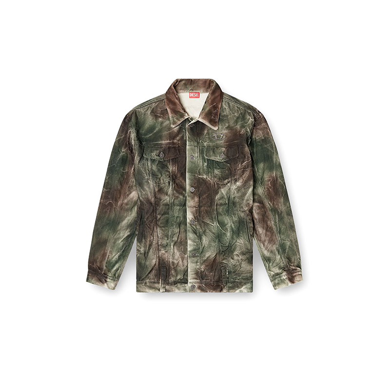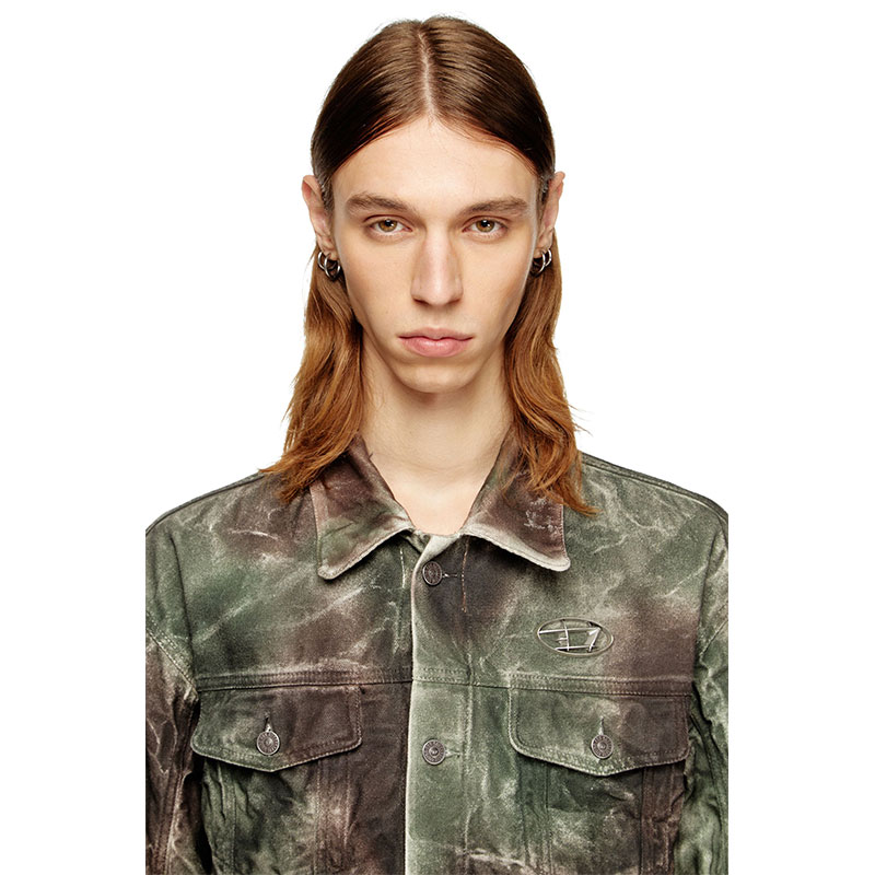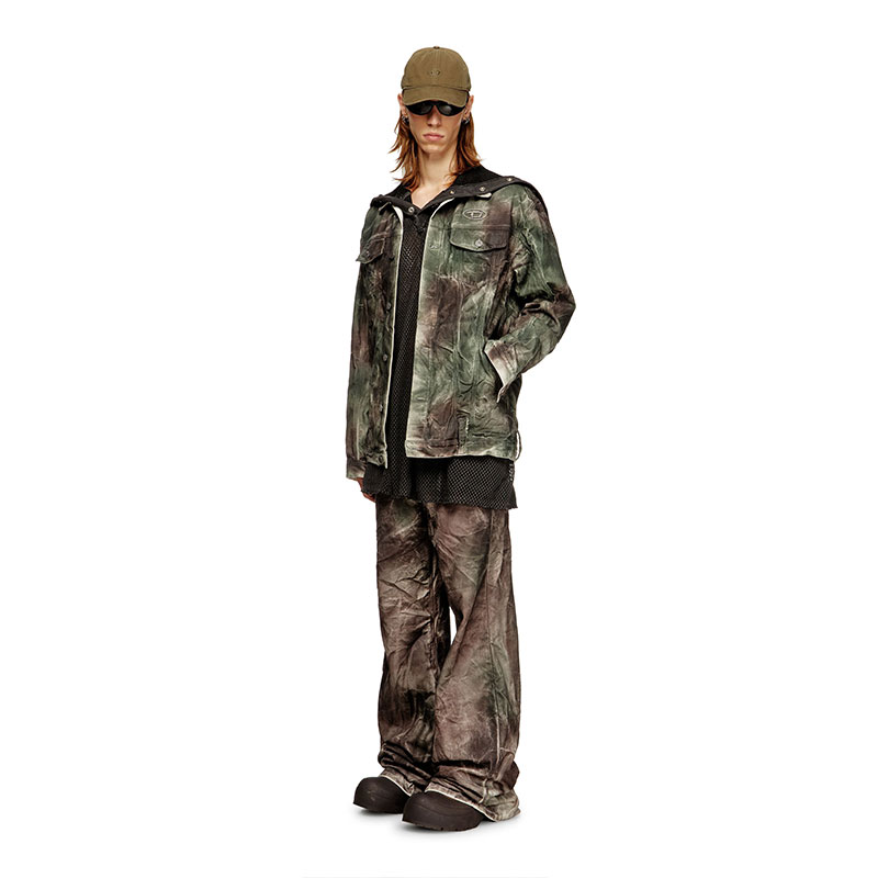 Diesel joins forces with Thug Club — a Seoul-born, now-global fashion label forged in the city’s youth underground and rooted in hip-hop, moto grit and Itaewon energy. From an eight-piece capsule alive with subversion and streetwear charge, this unisex trucker jacket features a grey-and-green abstract pattern, remixed with a hand-sprayed fade and battle-tested crinkled texture. The silhouette is relaxed, cut from hard-wearing cotton canvas. At the chest, the brands’ insignias fuse, broadcasting the partnership outright.