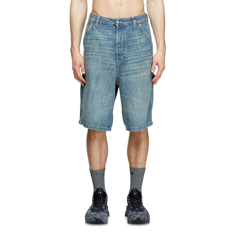 These men’s denim shorts feature a relaxed, knee-length fit and workwear-inspired details, such as the hammer loop and small patch pockets on the side of the leg.
